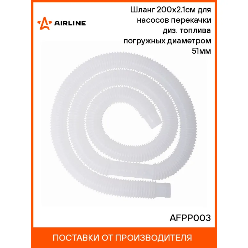 Шланг 200х2.1см для насосов перекачки диз. топлива погружных диаметром 51мм Описание: Применяется для облегчения процесса переливания жидкости из тары в тару. Подходит для насосов AIRLINE диаметром 51мм. Характеристики: Артикул: AFPP003 Материал: ПНД Резьбовое соединение: - Длина, см: 200 Рабочее давление, атм: 5 Максимальное давление, Атм: 7,5 Комплектация: Шланг 200х2.1см со стальным носиком - 1 шт Гарантия: от 1 года.