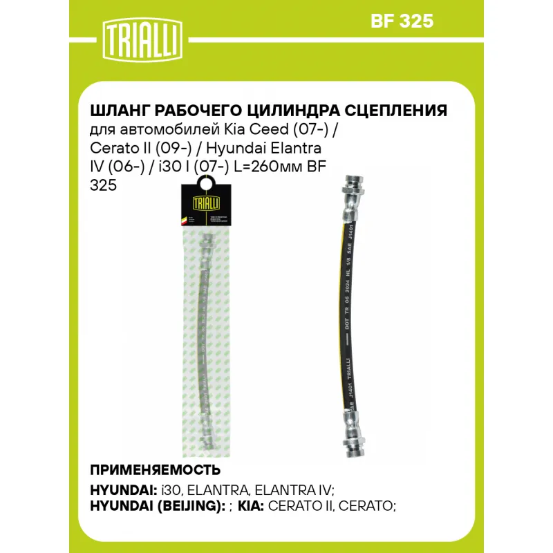Шланг рабочего цилиндра сцепления для автомобилей Kia Ceed (07-) / Cerato II (09-) / Hyundai Elantra IV (06-) / i30 I (07-) L=260мм Характеристики: Артикул: BF 325 OEM номера: 416401M000 Длина, мм: 260 Размер резьбы 1: M10x1 Размер резьбы 2: M10x1 Гарантийный срок: 2 года / 60 000 км Количество на автомобиль: 1 Товарная линейка: BLACK Комплектация: Шланг сцепления - 1 шт Гарантия: от 1 года.
