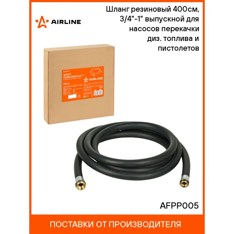 Шланг резиновый 400см, 3/4"-1" выпускной для насосов перекачки диз. топлива и пистолетов Описание: Резиновый шланг для насосов перекачки топлива и пистолетов со встроенными фитингами разного диаметра резьбы. Сохраняет эластичность и свойства при отрицательных температурах. Маслобензостойкий материал — бутадиен-нитрильный каучук. Резьба на изделии BSPT 3/4" - 1", что позволяет использовать этот шланг с пистолетами ARILINE, имеющими соединение 1". Характеристики: Артикул: AFPP005 Рабочее давление, атм: 0,1-10 Максимальное давление, aтм: 20 Тип шланга: неармированный Материал: бутадиен-нитрильный каучук Резьбовое соединение: 3/4"-1" Длина, см: 400 Комплектация: Шланг резиновый - 1 шт Гарантия: от 1 года.