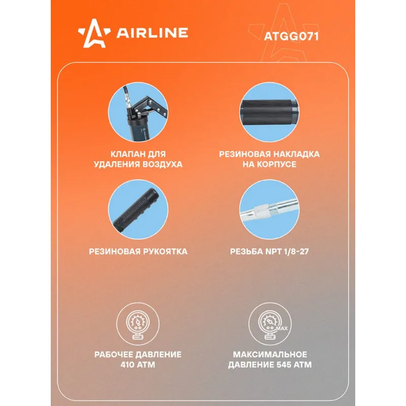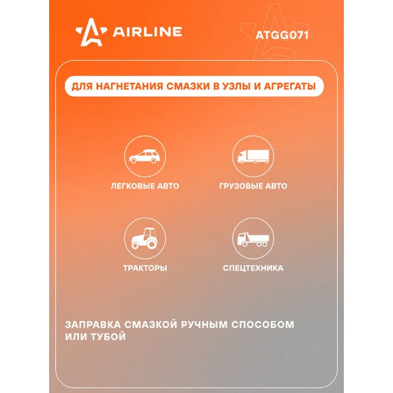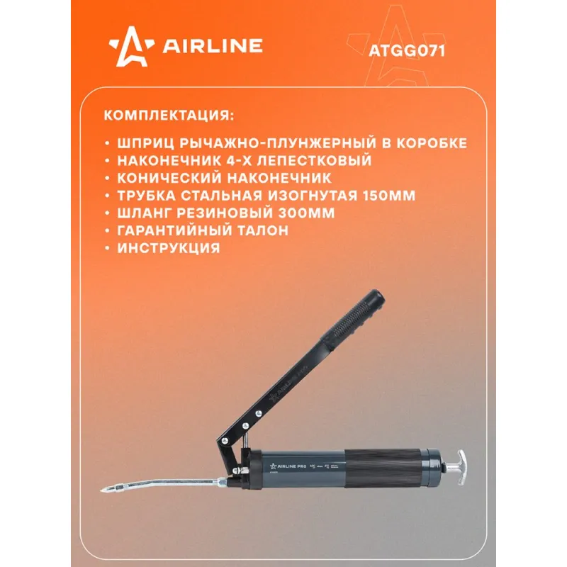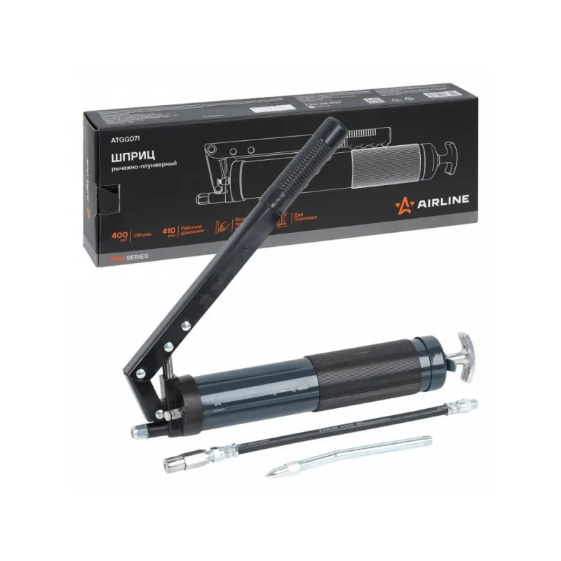 Шприц двухплунжерный 400см3 PRO, клапан уд. воздуха (возможно примен. картриджа) Описание: Шприц рычажно-плунжерный пистолетного типа PRO AIRLINE ATGG071 предназначен для нагнетания пластичной (консистентной) смазки в различные узлы и агрегаты, подверженные трению. Производится из высокопрочной стали на автоматизированном оборудовании, а прочный корпус имеет защитное покрытие. Применяется для обслуживания легковых автомобилей, грузовых, тракторов, спецтехники, промышленного оборудования и станков. Особенности инструмента: - Изделие имеет возможность заправки тремя способами: с помощью картриджа, ручным способом (шпателем/из емкости) и нагнетателем смазки через специальный клапан. - Присоединительная резьба - NPT 1/8-27; - Максимальное давление - 55 Mпа; - Работа двумя руками; - Использование с картриджем; - Подходит для профессионального использования в автомастерских, СТО, а также для самостоятельной работы с инструментом; - Инструкция на русском языке в комплекте; Шприц комплектуется резиновым износостойким шлангом 300мм, усиленной стальной трубкой 150мм, а также четырехлепестковым и коническим наконечником. Данная модель оснащена резиновой рукоятью для повышения удобства эксплуатации. Ручной нагнетатель для масла и смазки AIRLINE - отличный инструмент для замены устаревшей смазки, смазывания механизмов автомобиля и подачи новой смазки на детали машины. Такой инструмент можно преподнести в подарок любимому парню, мужу, брату, коллеге, другу, папе и дедушке на любой праздник, день рождения, Новый год и просто так. Характеристики: Артикул: ATGG071 Работа одной рукой: нет Работа двумя руками: да Ёмкость смазки, см.куб.: 400 Рабочее давление, атм: 410 Максимальное давление, aтм: 545 Работа с картриджем: Есть Ручное заполнение смазкой: Есть Клапан выпуска воздуха: Есть Клапан для заправки шприца смазкой: Есть Присоединительная резьба: NPT 1/8-27 Рабочее давление, Мпа: 41 Максимальное давление, Mпа: 55 Количество плунжеров: 2 Комплектация: Шприц рычажно-плунжерный в коробке - 1 шт Наконечник 4-х лепестковый - 1 шт Конический наконечник - 1 шт Трубка стальная изогнутая 150мм - 1 шт Шланг резиновый 300мм - 1 шт Гарантийный талон - 1 шт Инструкция - 1 шт Гарантия: от 1 года.