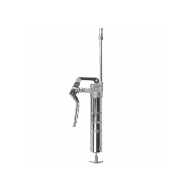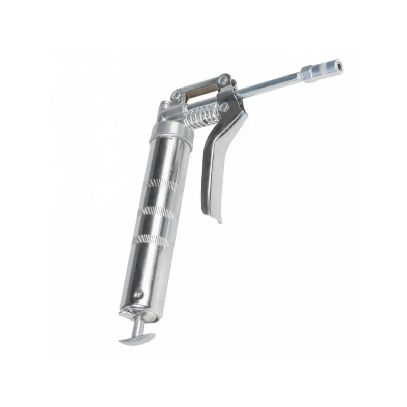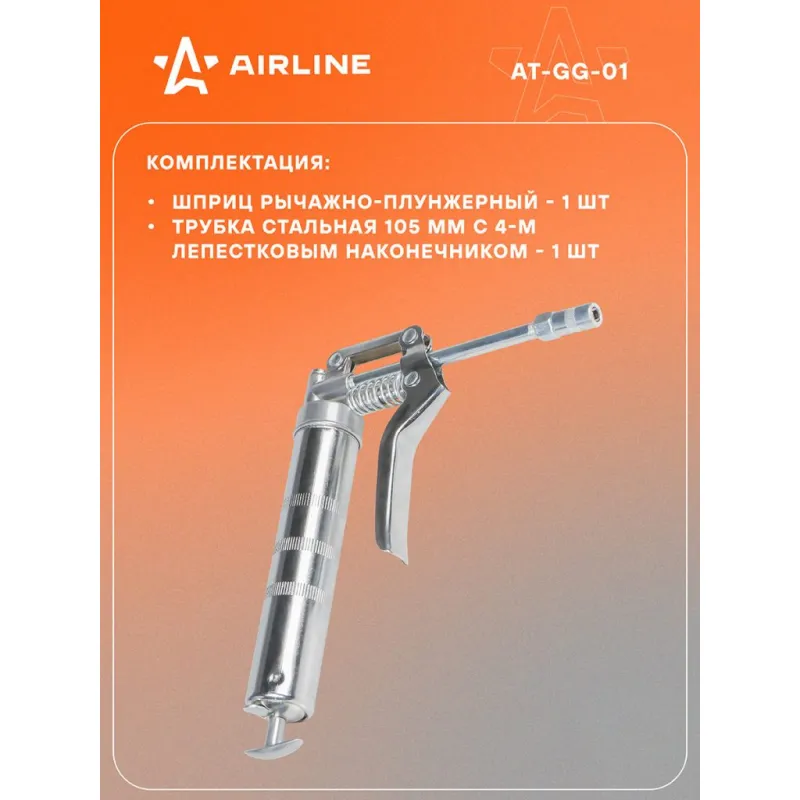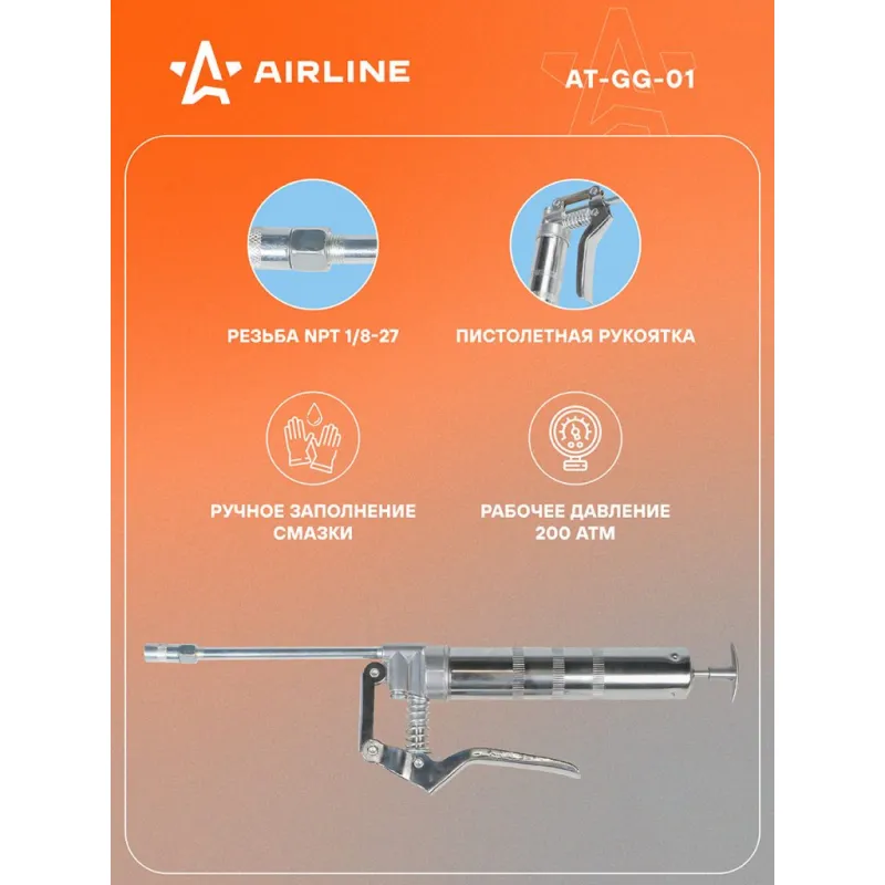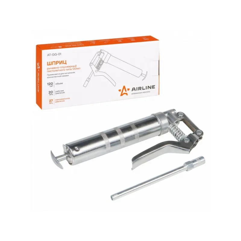 Шприц рычажно-плунжерный 120см3 Описание: Шприц рычажно-плунжерный пистолетного типа AIRLINE AT-GG-01 предназначен для нагнетания пластичной (консистентной) смазки в различные узлы и агрегаты, подверженные трению. Производится из высокопрочной стали на автоматизированном оборудовании, а прочный корпус имеет защитное покрытие. Применяется для обслуживания легковых автомобилей, грузовых, тракторов, спецтехники, промышленного оборудования и станков. Особенности инструмента: - Ручное заполнение смазкой. - Присоединительная резьба - NPT 1/8-27 ; - Максимальное давление - 27 Mпа; - Работа одной рукой; - Использование с картриджем; - Подходит для профессионального использования в автомастерских, СТО, а также для самостоятельной работы с инструментом; - Инструкция на русском языке в комплекте; Ручной нагнетатель для масла и смазки AIRLINE - отличный инструмент для замены устаревшей смазки, смазывания механизмов автомобиля и подачи новой смазки на детали машины. Такой инструмент можно преподнести в подарок любимому парню, мужу, брату, коллеге, другу, папе и дедушке на любой праздник, день рождения, Новый год и просто так. Характеристики: Артикул: AT-GG-01 OEM номера: 42021, 865512 Присоединительная резьба: NPT 1/8-27 Количество плунжеров: 1 Рабочее давление, атм: 200 Максимальное давление, aтм: 270 Максимальное давление, Mпа: 27 Работа одной рукой: да Работа двумя руками: нет Ёмкость смазки, см.куб.: 120 Работа с картриджем: Нет Ручное заполнение смазкой: Есть Клапан выпуска воздуха: Нет Клапан для заправки шприца смазкой: Нет Рабочее давление, Мпа: 20 Комплектация: Шприц рычажно-плунжерный - 1 шт Трубка стальная 105мм с 4-м лепестковым наконечником - 1 шт Гарантия: от 1 года.