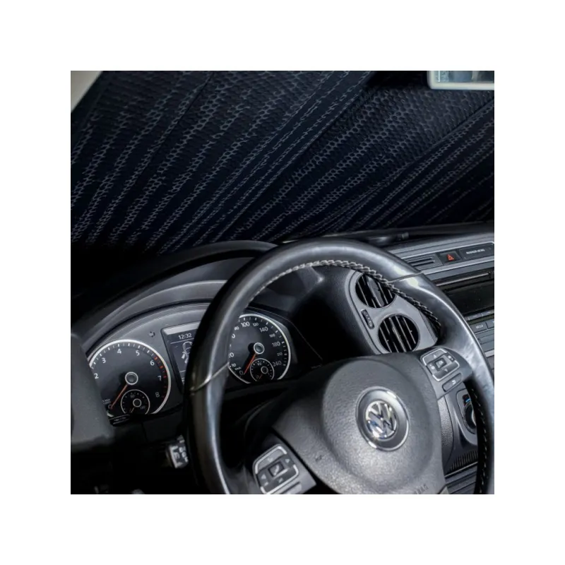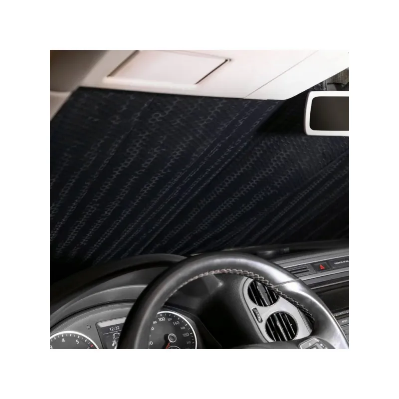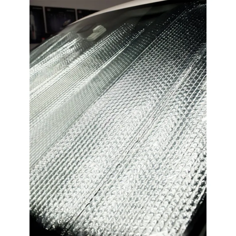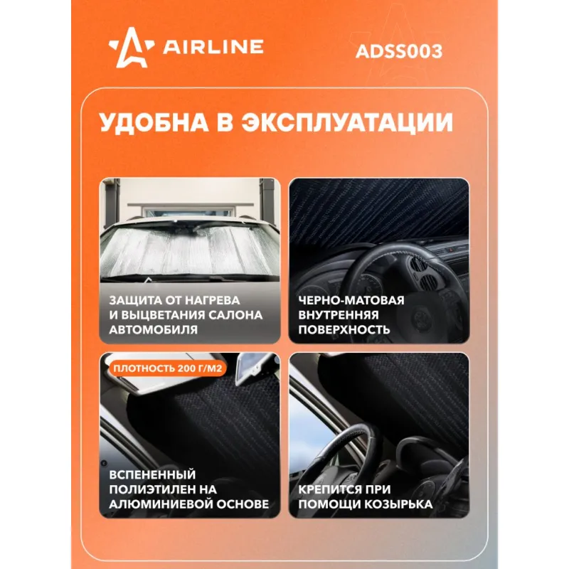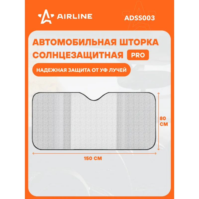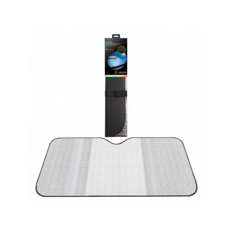 Шторка солнцезащитная PRO 80*150см на лобовое стекло, 200г/м2, черный/серый Описание: Бережная защита от солнца от бренда AIRLINE ADSS003 на лобовое стекло салона вашего автомобиля. Двусторонняя солнцезащитная шторка AIRLINE в машину размером необходима для блокировки попадания солнечных лучей со стороны лобового стекла в салон машины. Серебристая поверхность автошторки отражает солнечные лучи, защищая салон и торпедо автомобиля от перегрева. Внутренняя поверхность для красоты имеет черное матовое покрытие. Шторка имеет повышенную плотность (жесткость). Крепится к лобовому стеклу при помощи солнцезащитных козырьков. Высота шторки 80 см - идеальна для среднеразмерных автомобилей. Характеристики: Артикул: ADSS003 Цвет: черный/серебро Тип крепления: прижимается козырьками Плотность материала, г/м2: 200 Ширина, мм: 1500 Высота, мм: 800 Комплектация: Шторка - 1 шт Навершие - 1 шт Гарантия: от 1 года.