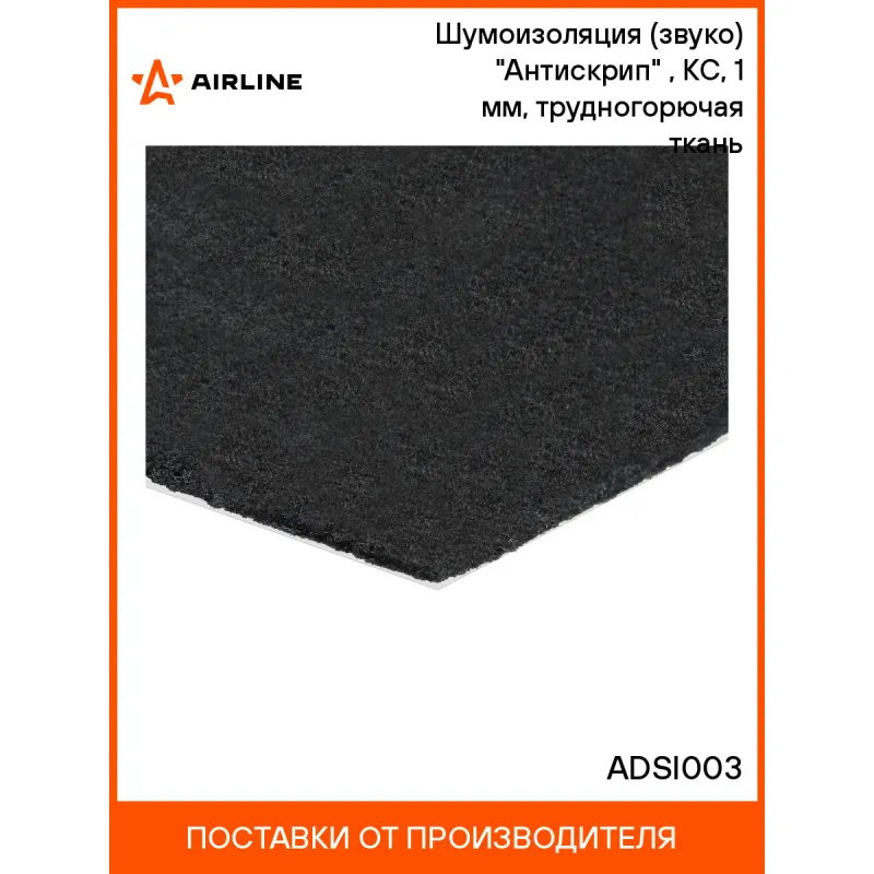 Шумоизоляция (звуко) "Антискрип" (75*100 см), КС, 1 мм, трудногорючая ткань Описание: Уплотнительный и декоративный материал на основе нетканого материала (черного цвета) толщиной 1,0 мм с клеевым слоем, защищенным силиконизированной бумагой. Применяется для устранения скрипа соприкасающихся деталей интерьера автомобиля, герметизации и уплотнения стыков и швов. Нетканая основа характеризуется оптимальной плотностью укладки волокон, что придает материалу высокую сопротивляемость истиранию. Характеристики: Артикул: ADSI003 Монтажные работы при темп., С: +10/+35 Ширина, мм: 500 Рабочий диапазон температур, С: -40/+120 Адгезия к металлу (не менее), Н/См2: 5 Липкость, Н/См2: 10 Клеевой слой: есть Запах: нет Длина изделия, мм: 1000 Толщина изделия, мм: 1 Ширина изделия, мм: 750 Комплектация: Шумоизоляция, лист - 1 шт Гарантия: от 1 года.