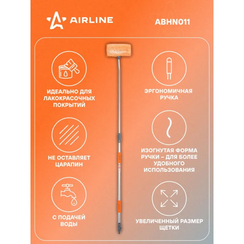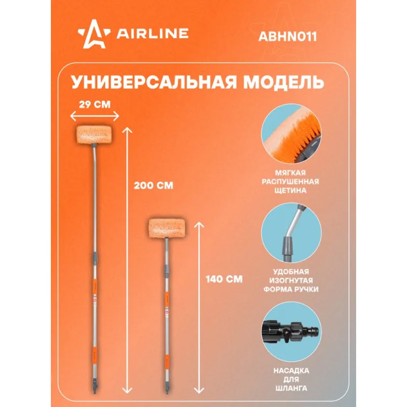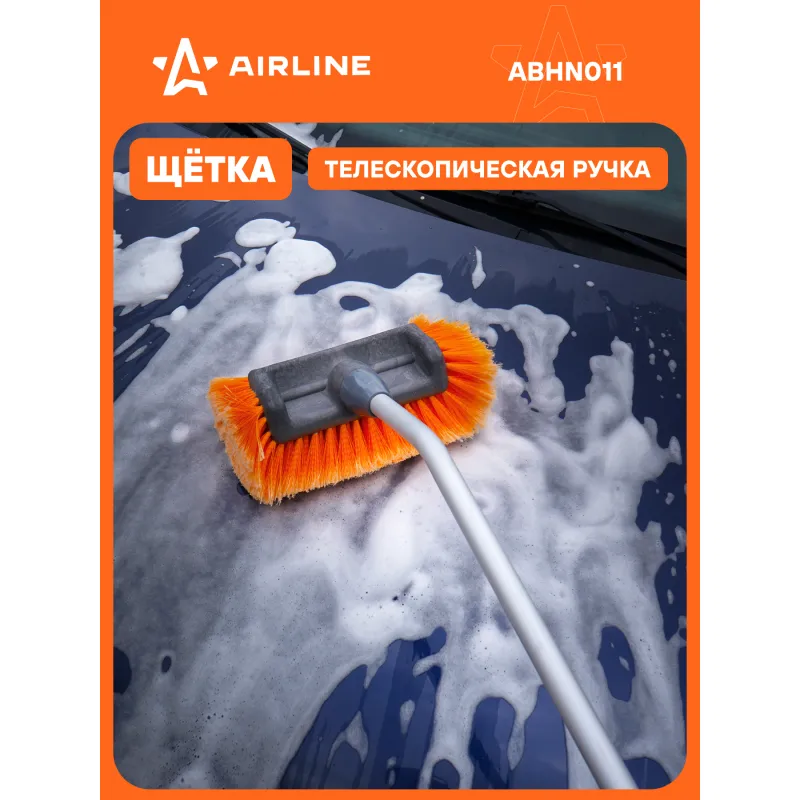 Швабра с насадкой для шланга, наклонной щеткой 29см и телескопической ручкой 140-200см Описание: Швабра AIRLINE ABHN012 длиной 200*140 см выполнена из высококачественного пластика и алюминия. Щетка располагается под углом для удобства использования. Телескопическая ручка позволяет регулировать длину. Съемная насадка щетки увеличенного размера 29 см см и выполнена из мягкой распушенной щетины. Имеется насадка для шланга для подключения подачи воды. Одно из главных преимуществ швабры - это выдвижная рукоять и длину можно регулировать и доставать до любых труднодоступных участков, включая высокий багажник. Благодаря этому, вы сможете без усилий очистить лобовое стекло, крышу, капот, борта грузового автотранспорта. Автощетка оснащена микрофиброй, которая обеспечивает очистку без появления царапин на лакокрасочных поверхностях. Длинный и мягкий ворс на насадке хорошо впитывает воду и отлично собирает пыль с кузова на сухую. У рукоятки два прочных зажима для регулировки длины, конструкция выполнена из высококачественного сплава алюминия, а это значит что она крепкая и легкая. Автошвабра удобно хранится в багажнике, в кладовке и легко найдет применение в быту. Автомобильная телескопическая щетка - это самый важный аксессуар который должен быть у каждого автолюбителя. Швабра AIRLINEв автомобиль повысит уровень комфорта во время путешествий и ежедневных поездок, поэтому станет нужным полезным подарком автомобилисту, мужу, папе, бату, дяде, жене, маме, сестре, тете, коллеге. Этот аксессуар для машины - это универсальный подарок на любой праздник, новый год, 23 февраля, 8 марта. В линейке AIRLINE, вы найдете широкий ассортимент высококачественных автотоваров и средств по уходу за вашим автомобилем щетки для окон, водосгоны, скребки, швабры. Мы гарантируем качество и надежность наших товаров. Характеристики: Артикул: ABHN012 Ширина щетки, см: 29 Длина в разложенном виде, см: 200 Длина в сложенном виде, см: 140 Щетина: мягкая распушенная Присоединительная резьба: Быстросьем + резьба внутренняя 3/4 Комплектация: Швабра - 1 шт Гарантия: от 1 года.