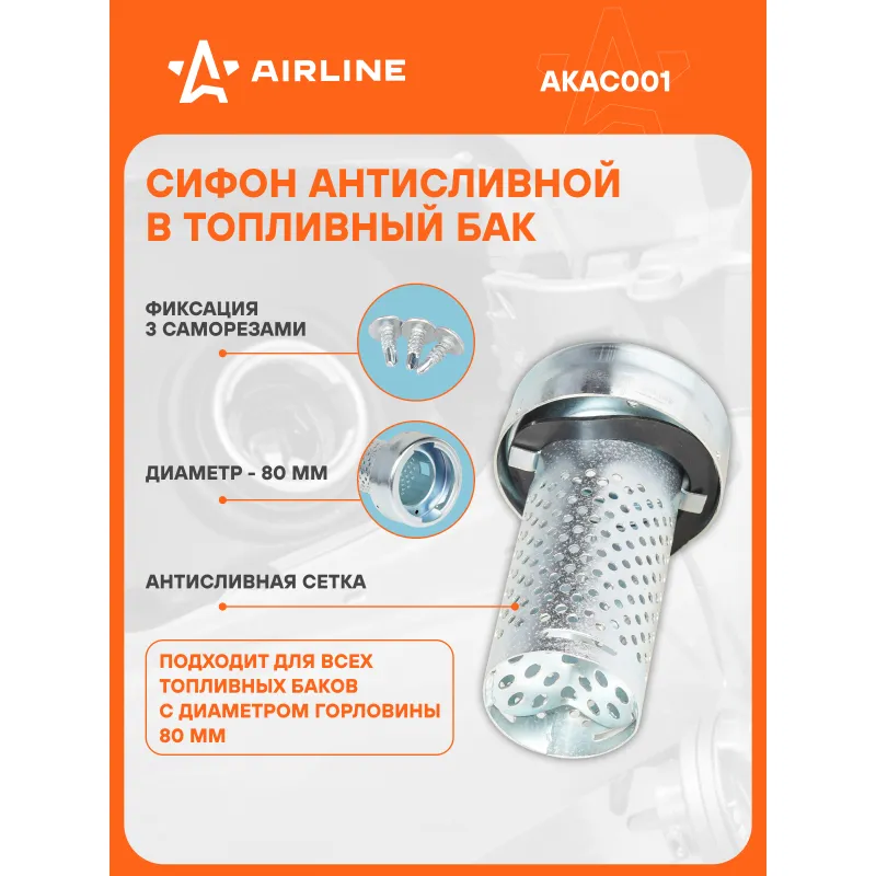Сифон антисливной с защитной сеткой в топл.бак 80мм для а/м Камаз, MAN, Volvo, MB, DAF Описание: Сифон антисливной с защитной сеткой в топливный бак для Камаз, MAN, Volvo, IVECO, DAF, MERCEDES-BENZ, RENAULT AIRLINE AKAC001 Защита от слива топлива представлена насадкой на горловину бака, напоминающей стакан с перфорациями. Топливо попадает в бак беспрепятственно, но слить топливо уже не получится, так как шланг не пройдет через небольшие отверстия. Подходит для всех топливных баков с диаметром горловины 80 мм. Применяемость: Kamaz 4310, 43253, 43261, 4350, 43502, 5320, 53229, 5350, 53605, 5410, 5460, 5490, 6350, 6450, 6520, 6522, 6540; DAF LF 55, CF 75, CF 85, XF 95, XF 105; IVECO EuroStar, EuroTrakker, EuroTech MP, EuroTech MH, P/PA-Haubenfahrzeuge, Stralis; RENAULT Midlum, C, G, Magnum, Premium; MAN G, G90, L2000, F2000, M90, F9, F90, M2000M, M2000L, Unterflur, TGA; MERCEDES-BENZ ACTROS, ACTROS MP2 / MP3, ATEGO, ATEGO 2, LP, LK, AXOR, AXOR II; VOLVO FH12, FH16; Характеристики: Артикул: AKAC001 Диаметр горловины, мм: 80 Клапан: нет Маслобензостойкая прокладка: Да Материал: Металл Комплектация: Антисливной сифон - 1 шт Винт для крепления - 2 шт Г-образный шестигранный ключ 3мм - 1 шт Гарантия: от 1 года.