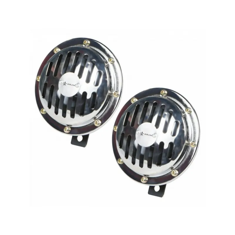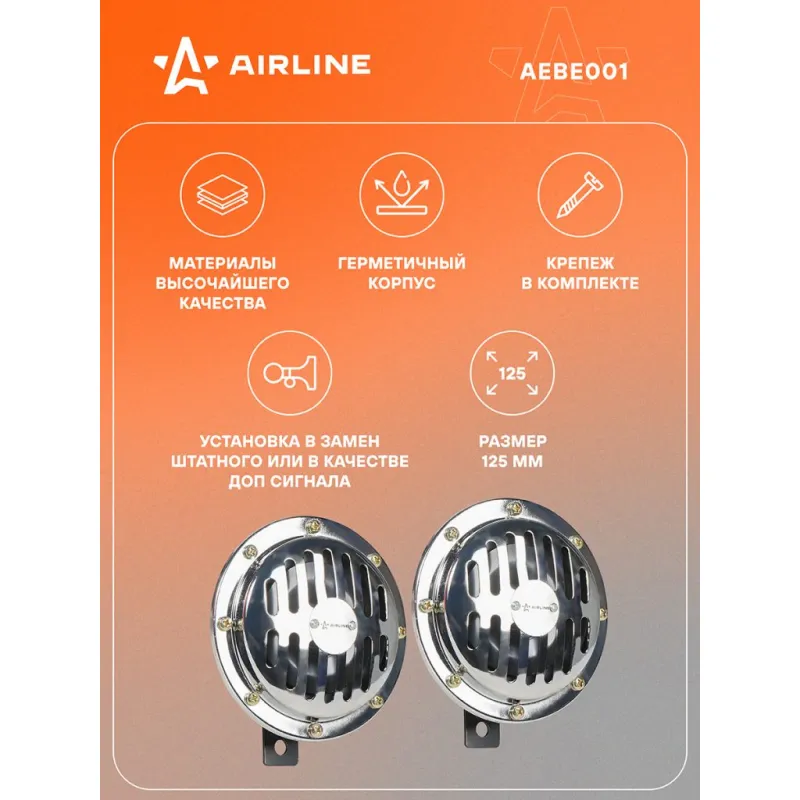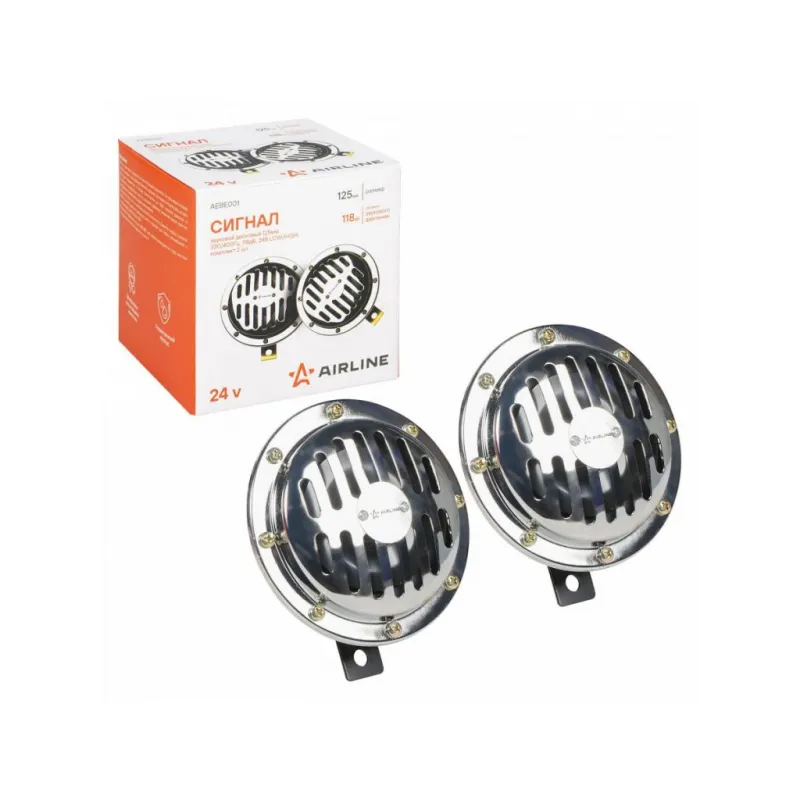 Сигнал звуковой дисковый 125мм 330/400Гц 118дБ 24В LOW/HIGH, кмпл. 2 шт. Описание: Комплект дисковых звуковых сигналов большого диаметра AEBE001 от бренда AIRLINE имеют инновационный дизайн и высококачественное звучание, благодаря которому ваш автомобиль будет выделяться в потоке. Особенности: - Тип - электрический; - Величина звукового давления - 118 дБ; - Частота звучания - LOW/HIGH 330/400 Гц; - Герметичный корпус; - Изготовлено из материалов высокого качества; - Комплект крепежа в комплекте; Комплект дисковых звуковых сигналов большого диаметра. Сигналы на машину имеют инновационный дизайн и высококачественное звучание, благодаря которому ваш автомобиль будет выделяться в потоке. Увеличенное до 118 дБ звуковое давление и оптимально подобранные частоты звучания привлекут внимание других участников дорожного движения к вашему автомобилю. Диаметр каждого сигнала 125 мм. Данный комплект универсальный и подходит для любых автомобилей с напряжением бортовой сети 24 В. Используйте звуковые сигналы AIRLINE для замены вышедших из строя штатных сигналов или в качестве элемента тюнинга. Набор дисковых звуковых сигналов для автомобиля, аксессуары для машины и салона авто, для внешнего и внутреннего тюнинга, идеальны в качестве подарка мужу, дедушке, мужчине, автомобилисту, на день рождения, новый год, 23 февраля и без повода. Характеристики: Артикул: AEBE001 Тип: электрический Величина звукового давления, дБ: 118 Номинальное напряжение, В: 24 Размер, мм: 125 Частота звучания LOW, Гц: 330 Частота звучания HIGH, ГЦ: 400 Комплектация: Сигнал - 2 шт Гарантия: от 1 года.