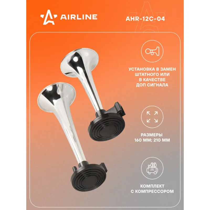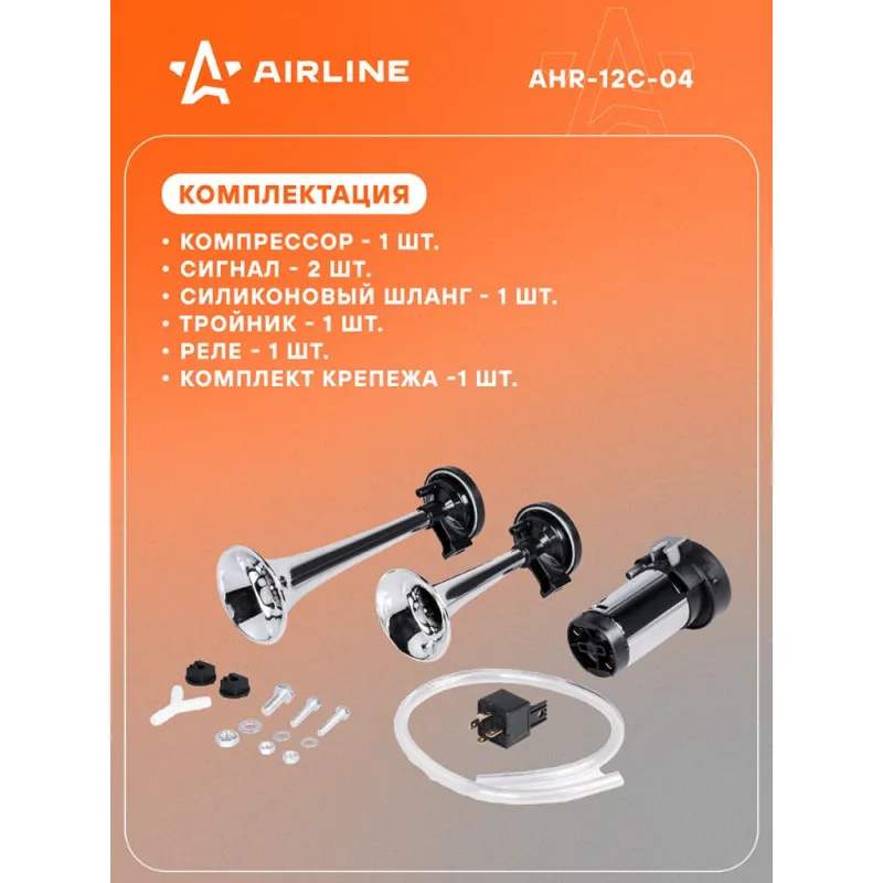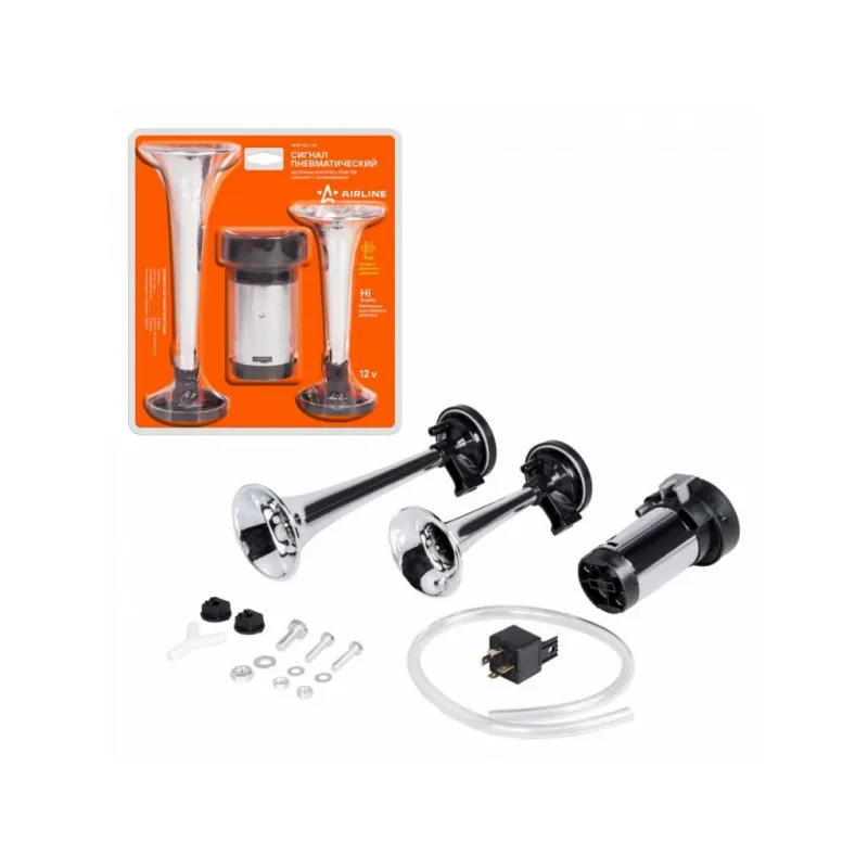 Сигнал звуковой пневматический 160/210мм 600/756Гц 115дБ 12В LOW/HIGH, с компрессором Описание: Комплект для установки с пневматическим сигналом и компрессором AHR-12C-04 от бренда AIRLINE. Компактный размер позволяет установить сигнал с компрессором практически на любой автомобиль. Особенности: - Тип - пневматический; - Величина звукового давления - 115 дБ; - Частота звучания - LOW/HIGH 600/756 Гц; - Герметичный корпус; - Изготовлено из материалов высокого качества; - Комплект крепежа в комплекте; Пневматический звуковой сигнал на машину имеют инновационный дизайн и высококачественное звучание, благодаря которому ваш автомобиль будет выделяться в потоке. Увеличенное до 115 дБ звуковое давление и оптимально подобранные частоты звучания привлекут внимание других участников дорожного движения к вашему автомобилю. Данный комплект универсальный и подходит для любых автомобилей с напряжением бортовой сети 12 В. Используйте звуковые сигналы AIRLINE для замены вышедших из строя штатных сигналов или в качестве элемента тюнинга. Пневматический звуковой сигнал для автомобиля, аксессуары для машины и салона авто, для внешнего и внутреннего тюнинга, идеальны в качестве подарка мужу, дедушке, мужчине, автомобилисту, на день рождения, новый год, 23 февраля и без повода. Характеристики: Артикул: AHR-12C-04 Частота звучания LOW, Гц: 600 Частота звучания HIGH, ГЦ: 756 Тип: пневматический Величина звукового давления, дБ: 115 Номинальное напряжение, В: 12 Размер min, мм: 160 Размер max, мм: 210 Комплектация: Компрессор - 1 шт Сигнал - 2 шт Силиконовый шланг - 1 шт Тройник - 1 шт Реле - 1 шт Комплект крепежа - 1 шт Гарантия: от 1 года.
