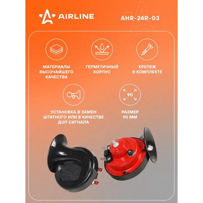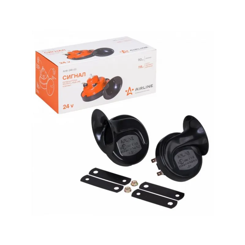 Сигнал звуковой рупорный 90мм 410/510Гц 118дБ 24В LOW/HIGH, кмпл. 2 шт. Описание: Комплект из двух автомобильных сигналов AHR-24R-03 от бренда AIRLINE. Могут устанавливаться в замен штатного сигнала или в качестве дополнения. Особенности: - Тип - электрический; - Величина звукового давления - 118 дБ; - Частота звучания - LOW/HIGH 410/510 Гц; - Герметичный корпус; - Изготовлено из материалов высокого качества; - Комплект крепежа в комплекте; Сигналы на машину имеют инновационный дизайн и высококачественное звучание, благодаря которому ваш автомобиль будет выделяться в потоке. Увеличенное до 118 дБ звуковое давление и оптимально подобранные частоты звучания привлекут внимание других участников дорожного движения к вашему автомобилю. Данный комплект универсальный и подходит для любых автомобилей с напряжением бортовой сети 24 В. Используйте звуковые сигналы AIRLINE для замены вышедших из строя штатных сигналов или в качестве элемента тюнинга. Набор рупорных звуковых сигналов для автомобиля, аксессуары для машины и салона авто, для внешнего и внутреннего тюнинга, идеальны в качестве подарка мужу, дедушке, мужчине, автомобилисту, на день рождения, новый год, 23 февраля и без повода. Характеристики: Артикул: AHR-24R-03 Частота звучания LOW, Гц: 410 Частота звучания HIGH, ГЦ: 510 Тип: электрический Величина звукового давления, дБ: 118 Номинальное напряжение, В: 24 Размер, мм: 90 Комплектация: Сигнал - 2 шт Комплект крепежа - 1 шт Гарантия: от 1 года.