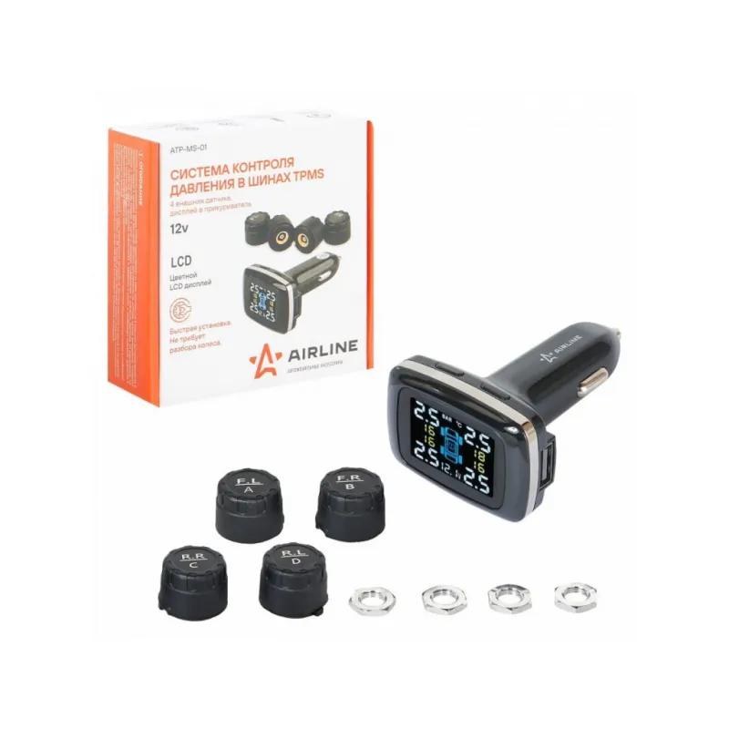 Система контроля давления в шинах TPMS, 4 внешних датчика, дисплей в прикуриватель Описание: Система контроля давления в шинах TPMS от бренда AIRLINE ATP-MS-01, с дисплеем с установкой в прикуриватель, представляет из себя комплект из 4 внешних датчиков давления и приёмного модуля с цветным ЖК дисплеем. Датчики монтируются на ниппель колеса автомобиля, измеряют давление и температуру воздуха в шине и передают информацию о значении давления по радиоканалу на дисплей. Приёмный модуль принимает информацию о давлении в шинах и отображает значения давления в шинах на встроенном ЖК индикаторе. Приёмный модуль вставляется в гнездо прикуривателя автомобиля. Датчики давления питаются от встроенных батареек CR1632, по одной штуке в каждом датчике. Заряда батареек хватает до 24 месяцев работы, батарейки можно заменить самостоятельно. При изменении давления в колесе система сигнализирует об этом водителю звуковыми сигналами и отображает информацию на дисплее. Пороговые значения давлений и температуры настраиваются в меню дисплея. На боковой панели приемного модуля есть выход USB 5В/1А для зарядки мобильных телефонов. Комплект может быть установлен самостоятельно. Особенности: *Быстрая установка, не требует разборки колеса; *Контроль давления/температуры в реальном времени; *Установка дисплея в прикуриватель; *Маленькие и легкие датчики; Подробное руководство по эксплуатации в комплекте. Перед использованием просьба ознакомиться с инструкцией. Товар официального производителя AIRLINE. Автотовар подойдет для личного и профессионального использования. Характеристики: Артикул: ATP-MS-01 Мин. Рабочая температура датчиков, °С: -20 Макс. Рабочая температура датчиков, °С: 80 Датчики: Внешние Питание: От прикуривателя 12 В Количество датчиков, шт: 4 Напряжение питания, В: 12 Вес датчика, г: 8 Частота передатчика датчиков, МГц: 433.87 – 434.14 Мощность передатчика, мВт: < 1.8 Диапазон измеряемого давления, bar: 0 - 3.5 Элементы питания: CR1632 Комплектация: Приёмник с дисплеем - 1 шт Датчик давления внешний - 4 шт Контргайка - 4 шт Ключ для монтажа датчиков - 1 шт Паспорт изделия - 1 шт Гарантийный талон - 1 шт Упаковочная коробка - 1 шт Гарантия: от 1 года.