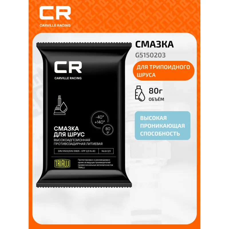 Смазка для шарикового ШРУС, литиевая, от -40 до +140°С, стик-пакет, 80 г Описание: Высокоадгезионная противозадирная комплексная пластичная литиевая смазка Carville Racing для шарикового шарнира равных угловых скоростей. Обладает высокой устойчивостью к вымыванию, отлично удерживается на металлических поверхностях, имеет высокие противозадирные характеристики. Характеристики: Артикул: G5150203 OEM номера: G060735A2, 0888700401, 40099-M0825, 28495AE0008A, 9004312, G000622, G000633, G052133A3, 481498201, 803498201, 803498201A, 803498201B, 803498201C, 803498201D, 803498201E, 1019761, 087989007, STC3435, 83190447919 Назначение: Для ШРУС Свойства: Противоизносные Рабочий температурный диапазон: от -40°С до +140°С Классификация по DIN 51 502/ DIN 51825: KPF 2/3 N-40 Классификация по NLGI: 2/3 Цвет: Черный Температура каплепадения: не ниже +195°С Область применения: Шариковые шарниры равных угловых скоростей. Узлы трения подверженные ударным нагрузкам. Цепные приводы, зубчатые передачи, лебедки, конвейеры, работающие при малых скоростях, на открытом воздухе. Нетто / Брутто: 80г / 83г Комплектация: Смазка - 1 уп Гарантия: от 1 года.