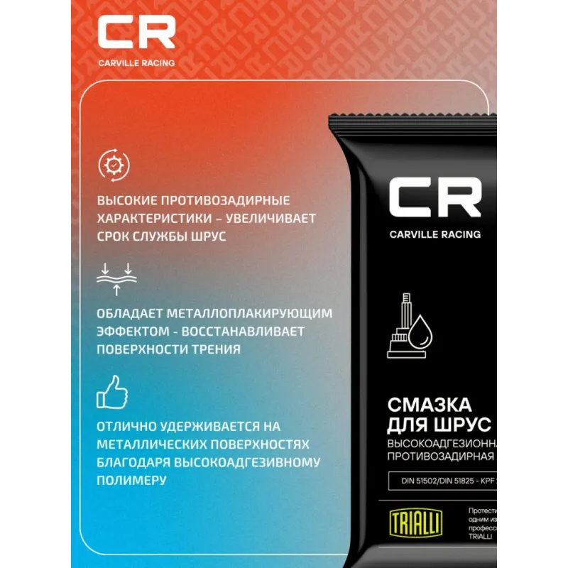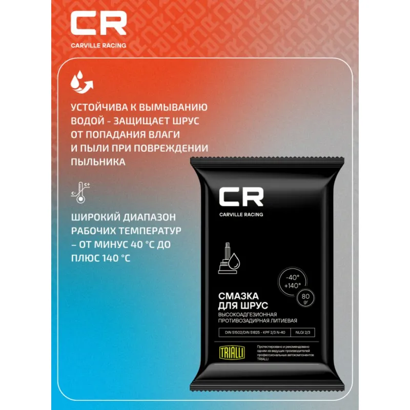 | Особенности и преимущества | Высокие противозадирные характеристики – увеличивает срок службы ШРУС; Обладает металлоплакирующим эффектом - восстанавливает поверхности трения; Отлично удерживается на металлических поверхностях благодаря высокоадгезивному полимеру; Устойчива к вымыванию водой - защищает ШРУС от попадания влаги и пыли при повреждении пыльника; Широкий диапазон рабочих температур – от минус 40 °С до плюс 140 °С. |