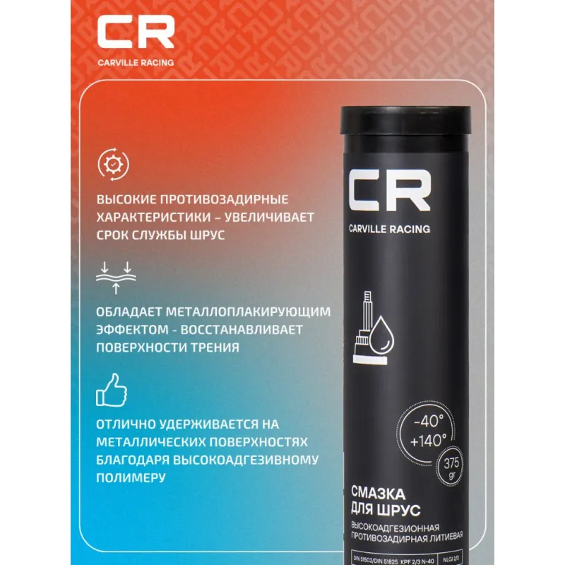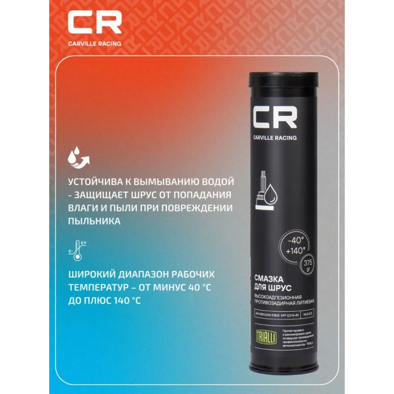 | Особенности и преимущества | Высокие противозадирные характеристики – увеличивает срок службы ШРУС; Обладает металлоплакирующим эффектом - восстанавливает поверхности трения; Отлично удерживается на металлических поверхностях благодаря высокоадгезивному полимеру; Устойчива к вымыванию водой - защищает ШРУС от попадания влаги и пыли при повреждении пыльника; Широкий диапазон рабочих температур – от минус 40 °С до плюс 140 °С. |