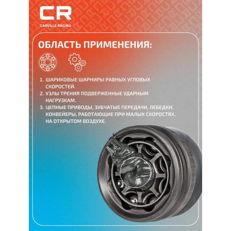 | Область применения | Шариковые шарниры равных угловых скоростей. Узлы трения подверженные ударным нагрузкам. Цепные приводы, зубчатые передачи, лебедки, конвейеры, работающие при малых скоростях, на открытом воздухе. |