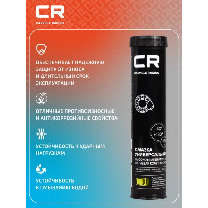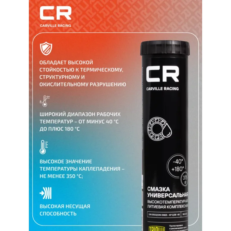 Смазка для ступичных подшипников, универсальная высокотемпературная литиевая комплексная, туба, 375 г Описание: Многоцелевая пластичная литиевая противозадирная высокотемпературная смазка Carville Racing предназначена для длительной эксплуатации в тяжелонагруженных автомобильных агрегатах с высокими скоростями скольжения и ударными нагрузками, в широком диапазоне температур. Область применения: подшипники ступиц, шаровые соединения, крестовины карданов легковых и грузовых автомобилей Характеристики: Артикул: G5150240 OEM номера: 08887-00600, 08887-00601, 08887-00700, 08887-00701, 08887-02201, 0888700101, 0888700201, 83232208093 Назначение: Для ШРУС Свойства: Противоизносные Рабочий температурный диапазон: от -40°С до +180°С Классификация по DIN 51 502/ DIN 51825: КР 2/3R -40 Классификация по NLGI: 2/3 Цвет: Синий Температура каплепадения: не ниже +350°С Область применения: Высоконагруженные узлы трения качения и скольжения автомобильного, судового, индустриального и строительного оборудования. Ходовая часть легковых и грузовых автомобилей, спецтехники, работающих в тяжелых условиях эксплуатации, в широком диапазоне температур – ступичные подшипники, подшипники сцепления, шаровые соединения, крестовины карданных валов и другие агрегаты. Подшипники качения и скольжения общепромышленного оборудования. Нетто / Брутто: 375г / 420г Комплектация: Смазка - 1 уп Гарантия: от 1 года.