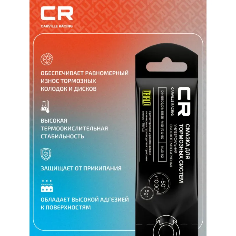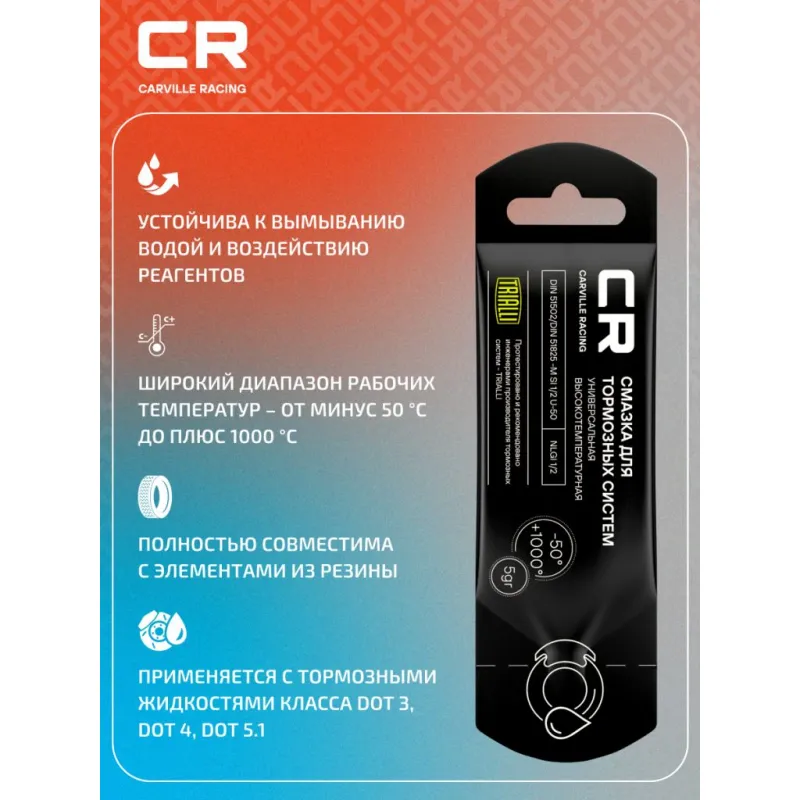 | Особенности и преимущества | Высокая термоокислительная стабильность; Обеспечивает равномерный износ тормозных колодок и дисков; Обладает высокой адгезией к поверхностям; Защищает от прикипания; Устойчива к вымыванию водой и воздействию реагентов; Полностью совместима с элементами из резины; Применяется с тормозными жидкостями класса DOT 3, DOT 4, DOT 5.1; Широкий диапазон рабочих температур – от минус 50 °С до плюс 1000 °С. |