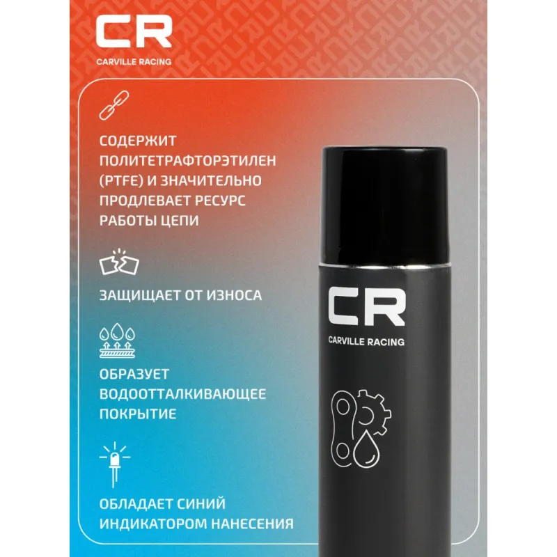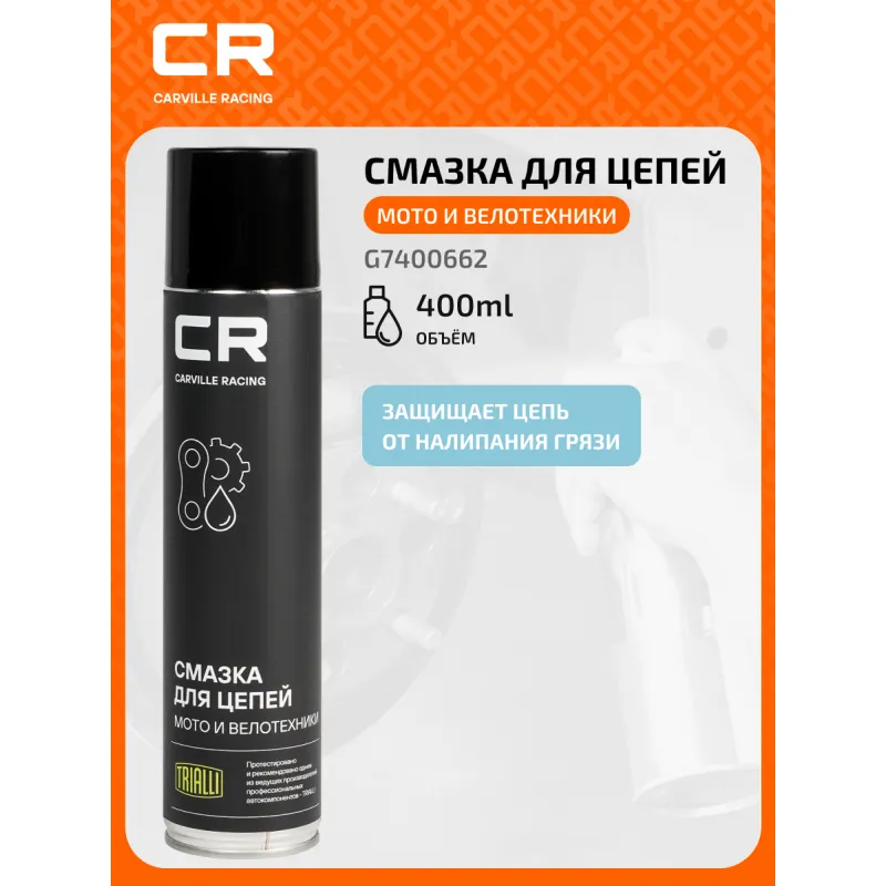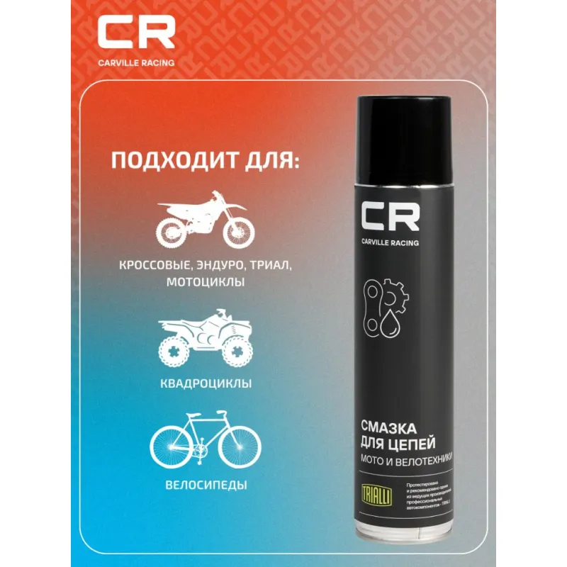 | Инструкция по применению | Очистите цепь с помощью «Очистителя тормозов CARVILLE RACING» и дождитесь полного высыхания. Перед использованием интенсивно встряхните баллон. Наносите смазку тонким слоем на нижнюю ветвь цепи по всей её длине, прокручивая привод. Удалите излишки смазки безворсовой тканью |