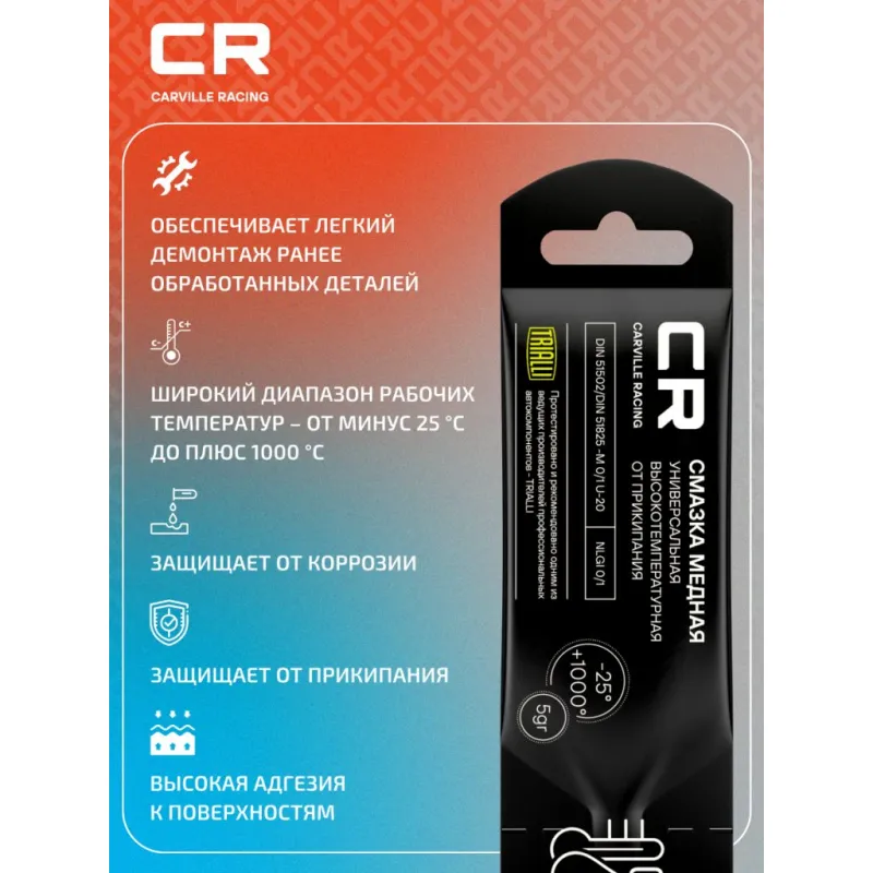 Смазка медная высокотемпературная, стик-пакет, 5 г Описание: Универсальная высокотемпературная медная пластичная смазка Carville Racing от прикипания. Применяется для узлов и агрегатов эксплуатируемых в условиях высоких температур и агрессивных сред. Предотвращает блокировку резьбовых соединений, сваривание и прикипание деталей Характеристики: Артикул: G5150255 Назначение: Универсальные Свойства: Разделяющие высокотемпературные Рабочий температурный диапазон: от -25°С до +1000°С Классификация по DIN 51 502/ DIN 51825: M 0/1 U-20 Классификация по NLGI: 0/1 Цвет: Медный Температура каплепадения: не ниже +210°С Область применения: Резьбовые соединения, эксплуатируемые в условиях высоких температур. Ступичная часть тормозных дисков. Ступичные шпильки. Противошумные пластины. Элементы выхлопной системы. Фланцевые соединения. Нетто / Брутто: 5г / 7г Комплектация: Смазка - 1 уп Гарантия: от 1 года.