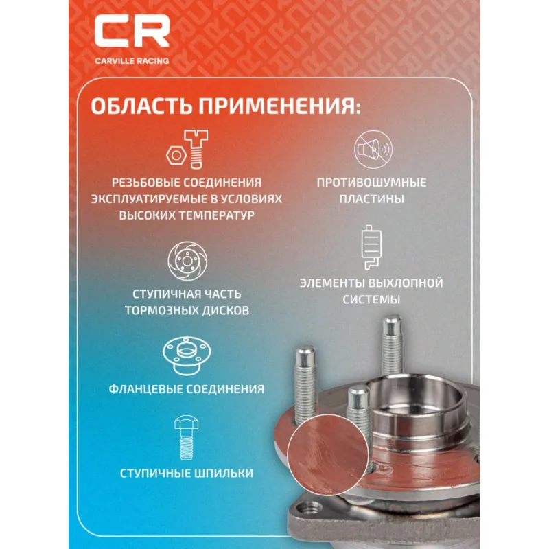 | Область применения | Резьбовые соединения, эксплуатируемые в условиях высоких температур. Ступичная часть тормозных дисков. Ступичные шпильки. Противошумные пластины. Элементы выхлопной системы. Фланцевые соединения. |
