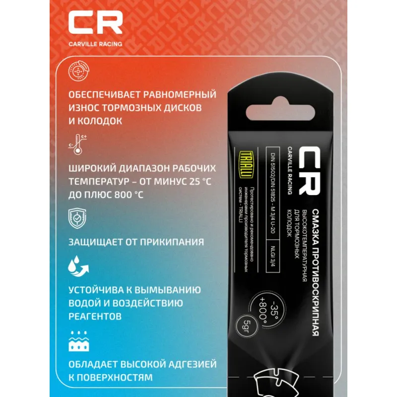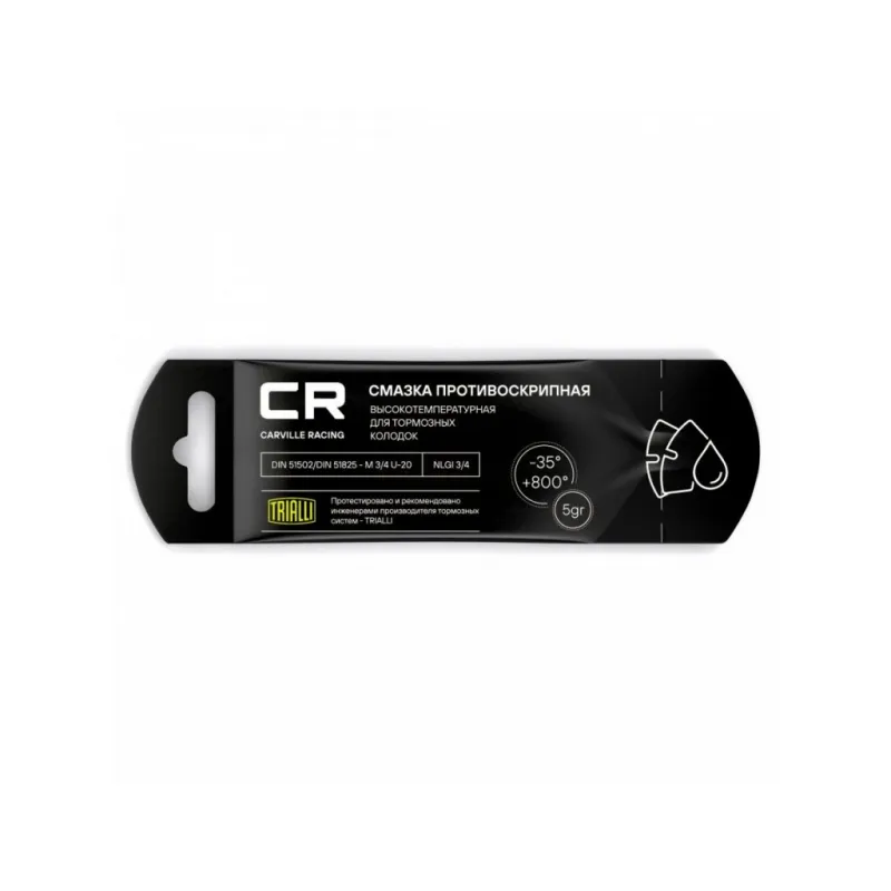 | Особенности и преимущества | Препятствует заклиниванию и возникновению скрипа Обеспечивает равномерный износ тормозных дисков и колодок Обладает высокой адгезией к поверхностям Защищает от прикипания Устойчива к вымыванию водой и воздействию реагентов Широкий диапазон рабочих температур – от минус 25 °С до плюс 800 °С |