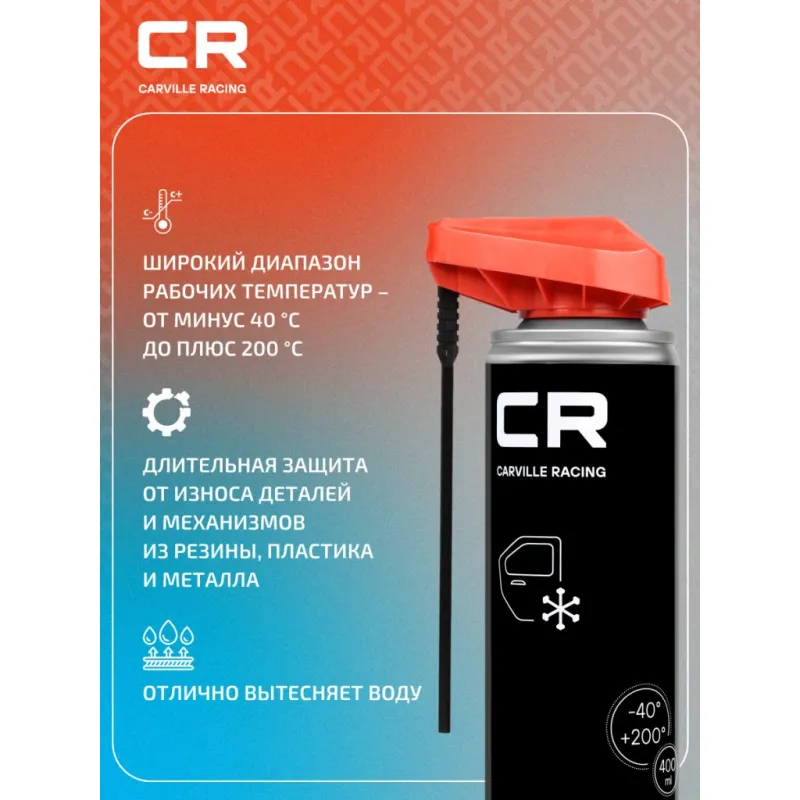 | Особенности и преимущества | Широкий диапазон рабочих температур – от минус 40 °С до плюс 200 °С; Длительная защита от износа деталей и механизмов из резины, пластика и металла; Отлично вытесняет воду; Эффективно устраняет посторонние шумы; Не имеет резкого запаха; Мультипозиционный распылитель 2 в 1 – для точного нанесения и распыления по большим площадям; Система полного опустошения баллона. |
