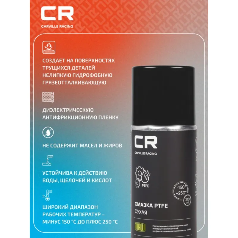 | Особенности и преимущества | Создает на поверхностях трущихся деталей нелипкую гидрофобную грязеотталкивающую диэлектрическую антифрикционную пленку. Предотвращающие прилипание и облегчает скольжение. Не содержит масел и жиров. Устойчива к действию воды, щелочей и кислот. Широкий диапазон рабочих температур – минус 150 °С до плюс 250 °С Удобная аэрозольная упаковка с системой полного опустошения баллона. |