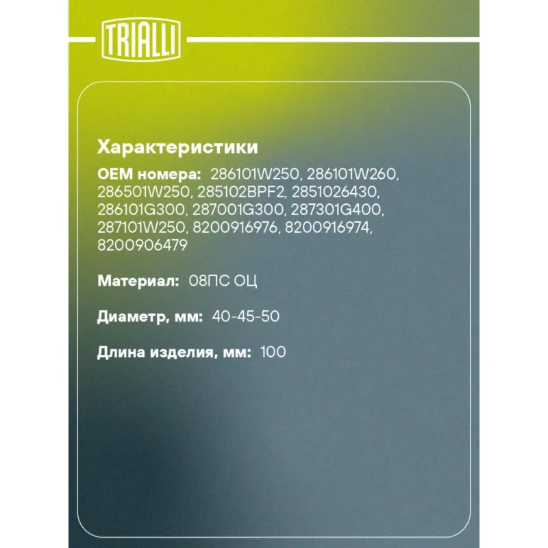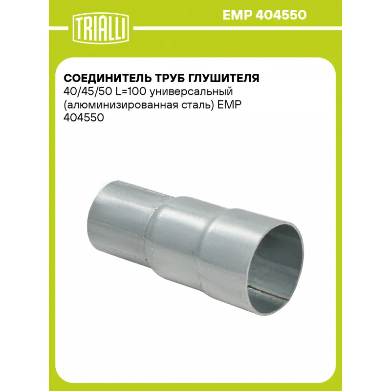 Соединитель труб глушителя 40/45/50 L=100 универсальный (алюминизированная сталь) Характеристики: Артикул: EMP 404550 OEM номера: 286101W250, 286101W260, 286501W250, 285102BPF2, 2851026430, 286101G300, 287001G300, 287301G400, 287101W250, 8200916976, 8200916974, 8200906479, 200100277R, 287301G450 Количество на автомобиль: 1 Гарантийный срок: 2 года/60 тыс. Длина изделия, мм: 100 Материал: 08ПС ОЦ Диаметр, мм: 40-45-50 Толщина стенок: 1.5 Товарная линейка: BLACK Дополнительная информация: Этикетка изделия может отличаться от представленной на фото Комплектация: Соединитель труб универсальный - 1 шт Гарантия: от 1 года.