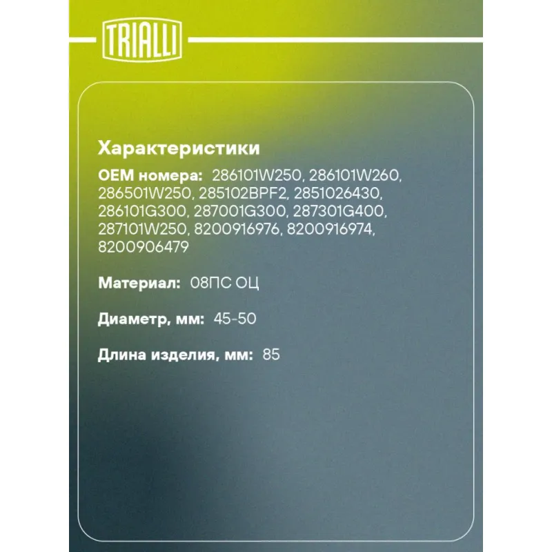 Соединитель труб глушителя 45/50 L=85 универсальный (алюминизированная сталь) Характеристики: Артикул: EPC 4550 OEM номера: 286101W250, 286101W260, 286501W250, 285102BPF2, 2851026430, 286101G300, 287001G300, 287301G400, 287101W250, 8200916976, 8200916974, 8200906479, 200100277R, 287301G450, 5Q0254500FX, 5Q0253209AA, 5Q0253209AD, 5E0253609G, 2505147010, 1742022110, 1710422120, 1741022560, 171040D100, 174100D330, 28710-A0150, 28650-A0150, 28610-A0100, 28610-M0150, 28650-M0150, 28710-M0100, 28710-M0150, 200101KA0A, 203001KA0A, 201001KA0A, 2505147070, 20010JD000, 20100JD00A, 171040D031, 1741022310, 1743022320, 174022140, 174600D050, 1742022010, 1743022120, 174101A480, 1742016720, 174301D010, 1746022010, B08A0BM701, 200105M370, 20300BM500, 20100BM520, B08A0-AU000, 20010BN805, 20300BN800, 20300BN810, 20010BN815, 203005M770, 1570A519, MR552606, MR993500, 1570A842, 1570B175, 1571A703, MN156051, 52039793, 94763377, 94763374, 20010-95F0B, 2001095F0C, 20300-95F0D, 20300-95F0C, 20300-95F0F, 20100-95F0A, 20100-95F0D, 28990-2A690, 28990-2A830, 28610-A2800, 28600-A2870, 28600-A2800, 2001000Q1A, 20010-00Q1J, 20010-00Q1K, Z6Y32050XC, Z6682050XA, Z60440300B, 1K0254505RX, 1K0254511LX, 1K0253209EN, 1K0253209J, 1K5253609, 1K0254500BX, 28610-C9100, 28650-M0100, 1K0254510X, 1K0253209BJ, 1Z3253609AE, 1K0253209CS, 1K5253609E, 1Z0253609AE, 1KO254303NX, 1F0254401FX, 1K0253209K, 28510-2B420, 285102B460, 28610-1H000, 28700-1H000, 289402A780, 28610-2L510, 28950-2A630, 28700-1H500, 1570A743, 1570B110, 1571A930, 1J0254502QX, 1J0253209, 1J5253609C, 1570B161, 1570B443, 28510-22BIH0, 28610-1H150, 28700-1H370, 28700-1H170, 1741028551, 1742028470, 1743028720, 28610-C9200, 28610-M0200, 28610-M0250, 28710-M0200, 28710-M0250, 17410-0V390, 17420-0V340, 17430-0V340, 14002JD90A, 20010JG02A, 20100JG05A, 208A0JD50A, 20100JG70A, 18190r07e00, 18210-SWY-E11, 18160-R07-E00, 18220-SWY-E01, 18307-SWY-E01, 2851023820, 28610-2E100, 28950-23756, 28650-2E120, 28700-2E120, 28650-2E150, 28700-2E151, 17410-0H450, 17420-36120, 17430-36170, 1570A94, 1570A094, 1570A837, 1571A622, 140029Y920, 200108H70A, 200188H70A, 203008H31A, 201008H70A, 28610-2E100, 2895037630, 286502E151, 28700-2E151, 286502E170, 287001F120, 286502E651, 287002E350, 1742028320, 1743028510, 18160RZPG00, 18210SWWE01, 18210-S10A01, 18160-P3FG10, 18160PHKG00, 18220-S10A03, 18030-S10A00, 1583A028, MN180083, MN156565, MN180617, 1570B398, 1571B053, 893253609B, 96182257, 96290793, 96350734, 96283770, D96182255, D96283770, 96182255, 96351601, 96350080, 96460432, 96553624, 96553627, 96553620, 96553593, 96536882, 96536912, 96870456, 96870457, 13317221, 13317220, 13252425, 96564101, 96603788, 96564099, 96340221, 96567437, 96571318, 96180144, 96184413, 96143650, 90352728, 90352798, 1306076, 1307934, 1340657, 1677746, 1364171, 30681700, 1307932, 1368331, 1368322, 287002200, 2870022000, 2870022001, 2870022100, 2865022200, 2865022201, 2865022510, 286104L000, 287301C065, 287001C060, 287001C710, 0K2NF40100A, 0K2NE40100B, 0K2NE40100C, 0K2NF40100, OK2AC40300F, OK2NC40300C, OK2NC40300B, OK2NC40300E, OK2AC40300C, OK2N140300B, OK2N140300, OK2AC40300D, OK2A340300F, OK2NB40300, F1201600, LBA1201200, 1571B134, 201005M710, 852882, 852965, 90280233, 90349966, 90398992, 90448262, 852287, 852324, 852881, 90280231, 90349965, 90398993, 90448261, 852966, 852355, 852883, 90280256, 90349967, 90399169, 852884, 90280502, 90349968, 90399170, 852356, 5852307, 5852699, 5852113, 5852855, 5852988, 852061, 852219, 852220, 852221, 852258, 852314, 852912, 852935, 90180581, 852811, 852812, 852830, 852899, 852936, 90215474, 90215475, 90215477, 90215478, 1730GP, 200107065R, 6001547676, 6001547674, 6001547675, 6001547673, 8200916975, 200100777R, 200107364R, 200109451R, 200107658R, 201005093R, 203006584R, 200105509R, 1J5253609S, 1J0253209E, 1J0253209F, 1J0253209G, 357253609A, 357253609M, 357253609H, 191253609BK, 191253609P, 191253609Q, 191253609BJ, 191253409BB, 191253409D, 191253409E, 191253409F, 191253409G, 191253409Q, 1H6253609P, 1H6253609T, 1H6253609A, 1H6253609G, 6RU253211, 6RU253091, 6RU253091C, 6RU253209C, 6RU253209E, 6RU253209D, 6RU253201, 6RU253609AH, 6RU253609AF, 6RU253609AD, 1J6253609C, 893253409B, 96345722, A131201210FA, T111201110, 1234018, 1253560, 1329718, 1677751, 1364172, 30681701, 1329731, 1201210F00B1, 1201010F00, 6RU253609, 6RU253611B, 6RU253609S, 6RU253609T , 6RU253611E, A11-1201210CA, OK2NC40100A, 4A0253609A, A11-1201110, A11-1201110BA, A11-1201210, 57253409C Количество на автомобиль: 1 Гарантийный срок: 2 года/60 тыс. Длина изделия, мм: 85 Материал: 08ПС ОЦ Диаметр, мм: 45-50 Толщина стенок: 1.5 Товарная линейка: BLACK Дополнительная информация: Этикетка изделия может отличаться от представленной на фото Комплектация: Соединитель труб универсальный - 1 шт Гарантия: от 1 года.