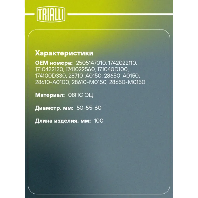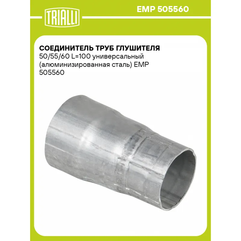 Соединитель труб глушителя 50/55/60 L=100 универсальный (алюминизированная сталь) Характеристики: Артикул: EMP 505560 OEM номера: 2505147010, 1742022110, 1710422120, 1741022560, 171040D100, 174100D330, 28710-A0150, 28650-A0150, 28610-A0100, 28610-M0150, 28650-M0150, 28710-M0100, 28710-M0150, 8200916974, 8200906479, 200100277R, 8200916976 Количество на автомобиль: 1 Гарантийный срок: 2 года/60 тыс. Длина изделия, мм: 100 Материал: 08ПС ОЦ Диаметр, мм: 50-55-60 Толщина стенок: 1.5 Товарная линейка: BLACK Дополнительная информация: Этикетка изделия может отличаться от представленной на фото Комплектация: Соединитель труб универсальный - 1 шт Гарантия: от 1 года.