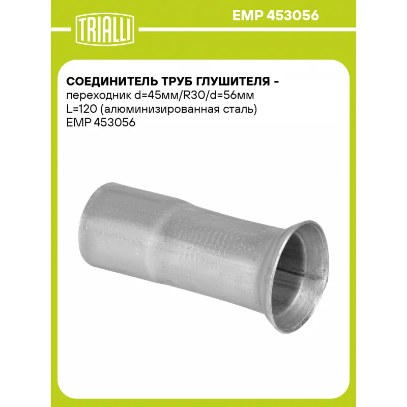 Соединитель труб глушителя - переходник d=45мм/R30/d=56мм L=120 (алюминизированная сталь) Характеристики: Артикул: EMP 453056 OEM номера: 285102BPF2, 286101G300, 287001G300, 287301G400, 286101W250, 286101W260, 286501W250, 287101W250, 287301G450, 8200916974, 2851026430 Количество на автомобиль: 1 Гарантийный срок: 2 года/60 тыс. Длина изделия, мм: 120 Материал: 08ПС ОЦ Диаметр, мм: 45-56 Толщина стенок: 1.5 Товарная линейка: BLACK Дополнительная информация: Этикетка изделия может отличаться от представленной на фото Комплектация: Соединитель труб глушителя - 1 шт Гарантия: от 1 года.