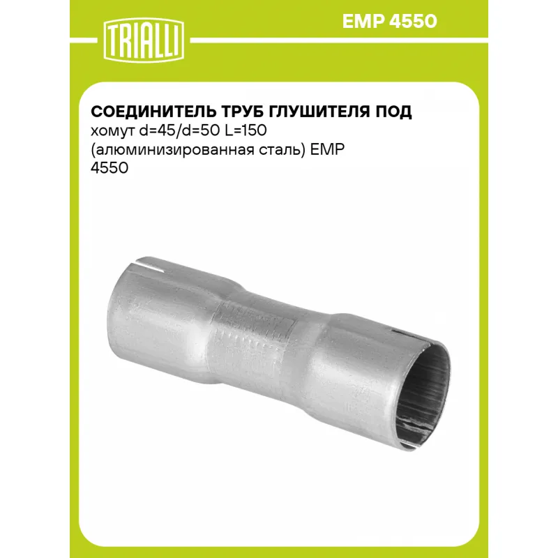 Соединитель труб глушителя под хомут d=45/d=50 L=150 (алюминизированная сталь) Характеристики: Артикул: EMP 4550 OEM номера: 285102BPF2, 286101G300, 287001G300, 287301G400, 286101W250, 286101W260, 286501W250, 287101W250, 287301G450, 8200916974, 2851026430 Количество на автомобиль: 1 Гарантийный срок: 2 года/60 тыс. Длина изделия, мм: 150 Материал: 08ПС ОЦ Диаметр, мм: 45-50 Толщина стенок: 1.5 Товарная линейка: BLACK Дополнительная информация: Этикетка изделия может отличаться от представленной на фото Комплектация: Соединитель труб глушителя - 1 шт Гарантия: от 1 года.