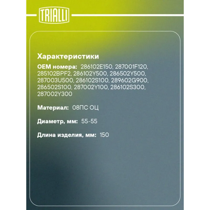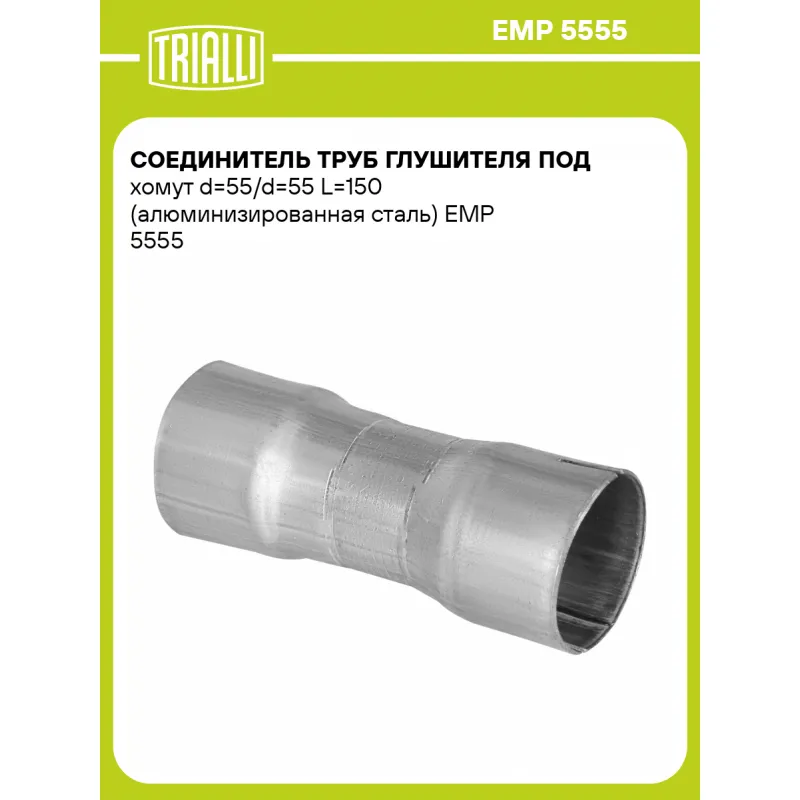 Соединитель труб глушителя под хомут d=55/d=55 L=150 (алюминизированная сталь) Характеристики: Артикул: EMP 5555 OEM номера: 286102E150, 287001F120, 285102BPF2, 286102Y500, 286502Y500, 287003U500, 286102S100, 289602G900, 286502S100, 287002Y100, 286102S300, 287002Y300, 286502E651, 287002E350, 289902F000, 20010JD200, 20100BR20A, 20010JD000, 20100JD00A, 20010JD20B, 208A0JG10B, 20010BR40A, 20100JD71B, 1583A028, 1570A842, 1570B175, 1571A703, 28610-C9200, 28610-M0200, 28610-M0250, 28710-M0200, 28710-M0250, 17410-0V390, 17420-0V340, 17430-0V340, 20010JG02A, 20100JG05A, 20100JG70A, 18190-R07-E00, 18210-SWY-E11, 18160-R07-E00, 18220-SWY-E01, 18307-SWY-E01, 28510-23820, 28610-2E100, 28950-23756, 28650-2E120, 28700-2E120, 28650-2E150, 28700-2E151, 17410-0H450, 17420-36120, 17430-36170, 1570A94, 1570A094, 1570A837, 1571A622, 140029Y920, 200108H70A, 200188H70A, 203008H31A, 201008H70A, 1K0254510X, 1K0253209BJ, 1Z3253609AE, 1K0253209CS, 1K5253609E, 1Z0253609AE, 18160RZPG00, 18210SWWE01, 18210-S10A01, 18160-P3FG10, 18160-PHK-G00, 18220-S10A03, 18030-S10A00, MN180083, MN156565, MN180617, 1570B398, 1571B053, 4А0253609A, 893253409B, 57253409С, 286502S300, 28950337630, 2895037630, 1741037320, 1742037040, 1743037371, 2505126020, 1743026743, 2505126080, 1714137100, 1714037321, 1742037120, 1743037521, 2505126130, 1741026470, 2505128340, 1741028582, 1742028712, 1743037372, 1741028551, 1742028470, 1743028720, 1742028320, 1743028510 Количество на автомобиль: 1 Гарантийный срок: 2 года/60 тыс. Длина изделия, мм: 150 Материал: 08ПС ОЦ Диаметр, мм: 55-55 Толщина стенок: 1.5 Товарная линейка: BLACK Дополнительная информация: Этикетка изделия может отличаться от представленной на фото Комплектация: Соединитель труб глушителя - 1 шт Гарантия: от 1 года.
