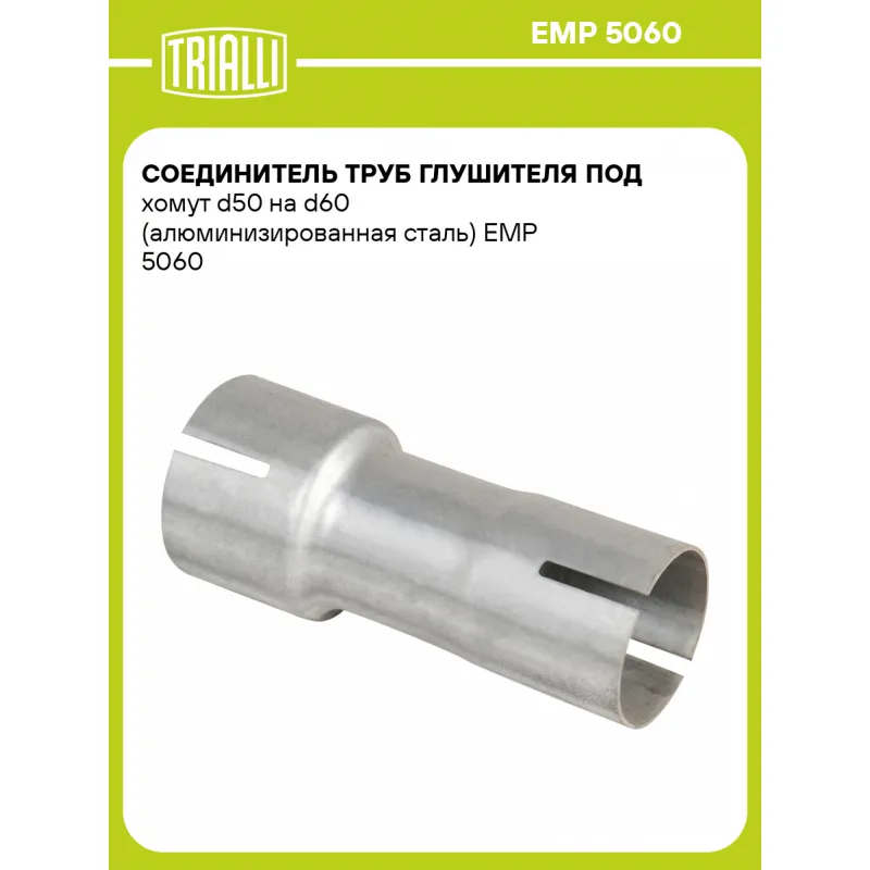 Соединитель труб глушителя под хомут d50 на d60 (алюминизированная сталь) Характеристики: Артикул: EMP 5060 OEM номера: 4A0253609A Количество на автомобиль: 1 Гарантийный срок: 2 года/60 тыс. Длина изделия, мм: 150 Материал: 08ПС ОЦ Особенности конструкции:: Выход/вход под трубу диаметром, мм: 50/60 Диаметр, мм: 50-60 Толщина ст... Читать полностью →