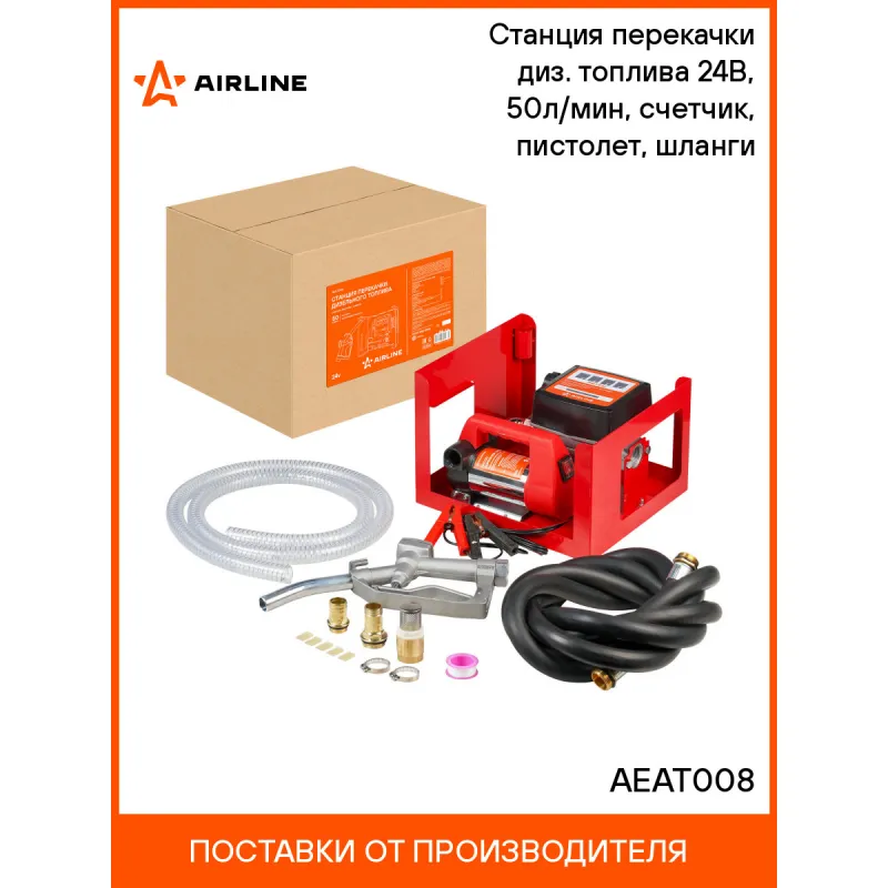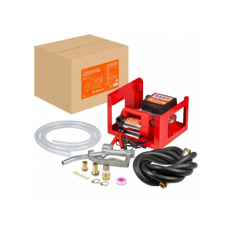 Станция перекачки диз. топлива 24В, 50л/мин, счетчик, пистолет, шланги Описание: Станция перекачки дизельного топлива AIRLINE AEAT008 24В предназначена для удобной и быстрой перекачки дизельного топлива и керосина из бочек, цистерн и других ёмкостей. Станция поставляется в комплекте с необходимыми элементами: всасывающим и выпускным шлангом, механическим счётчиком, а также топливораздаточным пистолетом. Производительность станции составляет до 50 л/мин, что обеспечивает высокую скорость перекачки. Для корректной работы необходимо соблюдать рекомендуемый режим: 15 минут работы — 30 минут перерыва. В комплект входят: топливораздаточный пистолет, механический счётчик для контроля объёма перекачки, заборный ПВХ шланг, выпускной резиновый шланг, два патрубка 25 мм с уплотнительными кольцами, сетчатый фильтр из нержавеющей стали, стальные хомуты, лента для уплотнения резьбовых соединений, Насос укомплектован зажимами типа "крокодил" с усиленной изоляцией, также к насосу идет пять запасных лопаток для ротора насоса. Насос оснащён перепускным клапаном, что позволяет использовать с ним различные виды пистолетов. Все компоненты станции изготовлены из прочных, износостойких материалов и прошли тестирование в собственной лаборатории AIRLINE. Станцию категорически нельзя использовать для перекачки легковоспламеняющихся или агрессивных жидкостей с высокой степенью летучести паров (бензин, растворители, горючие спирты). Характеристики: Артикул: AEAT008 Напряжение питания, В: 24 Производительность, л/мин: 50 Длина кабеля питания, см: 160 Тип перекачиваемой жидкости: дизель, керосин, антифриз Диаметр патрубка, мм: 25 Мощность, Вт: 160 Тип насоса: переносной Потребляемый ток, А: 6,7 Цикл работа/отдых, мин: 15/30 Комплектация: Насос - 1 шт Счетчик 1" 20-120л/мин для дизельного топлива, шестеренчатый - 1 шт Пистолет топливораздаточный 1" 60 л/мин - 1 шт Шланг резиновый 400см, 1" выпускной для насосов и пистолетов - 1 шт Шланг ПВХ 200смх2,5см заборный для насосов - 1 шт Присоединительный патрубок - 2 шт Стальной хомут - 3 шт Фильтр сетчатый - 1 шт Уплотнительная лента - 1 шт Запасная пластиковая лопатка ротора - 5 шт Инструкция - 1 шт Гарантийный талон - 1 шт Коробка - 1 шт Гарантия: от 1 года.
