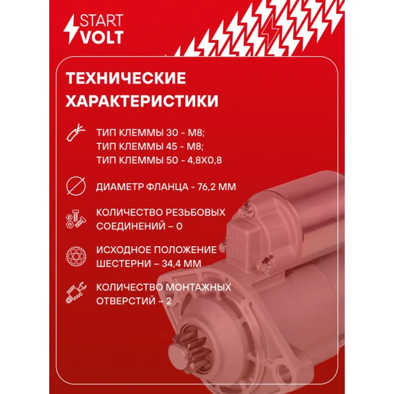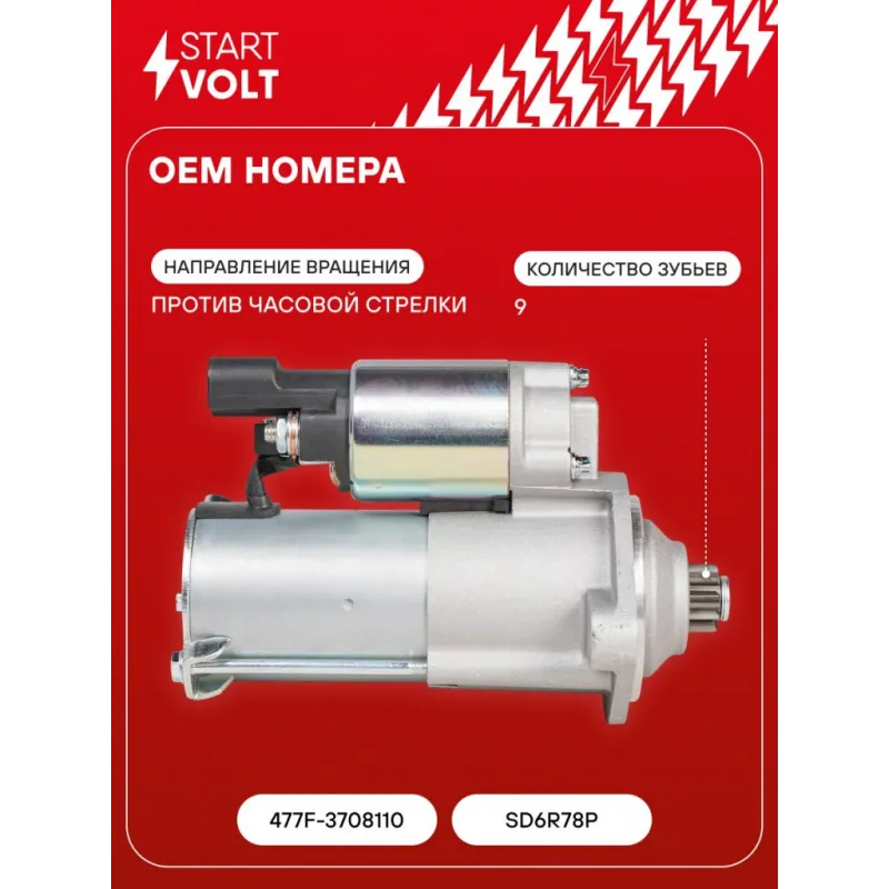 Стартер для автомобилей Chery Tiggo 4 (17-)/Bonus (11-) 1.5i/2.0i 1,3кВт Описание: Оригинальный стартер STARTVOLT LSt 2707 мощностью 1,3 кВт предназначен для пуска автомобильного двигателя внутреннего сгорания. Предназначен для автомобилей CHERY BONUS, TIGGO 5.. Подбор по VIN-номеру вашего автомобиля - через кнопку 'Задать вопрос'. Специалист проверит применяемость и ответит вам. Полностью повторяет параметры оригинальных изделий, обеспечивая надёжный запуск двигателя при любых условиях. Изготовлен с соблюдением оригинальных геометрических параметров, полностью совместим с заводскими узлами. Преимущества: • Полное соответствие оригинальным узлам; • Совместим с оригинальными деталями; • Длительный срок службы и устойчивость к износу; • Стабильная работа системы запуска; • Высокоточная сборка с пооперационным контролем качества; • Каждый стартер проходит стендовое тестирование — протокол в комплекте; • Надёжность при любом запуске двигателя; • STARTVOLT — 15 лет на рынке автоэлектрики — нам доверяют профессионалы; • Сертифицирован по стандарту EAC (ЕАЭС) — соответствует требованиям безопасности и качества. Товар новый, не восстановленный. Готов к установке. Отличный выбор для уверенного запуска двигателя в любых условиях. Характеристики: Артикул: LSt 2707 OEM номера: 477F-3708110, SD6R78P Номинальное напряжение, В: 12 Количество зубьев: 9 Направление вращения: против часовой стрелки Мощность, кВт: 1,3 Тип клеммы 30: M8 Тип клеммы 45: M8 Тип клеммы 50: 4,8x0,8 Количество резьбовых соединений: 0 Диаметр фланца, мм: 76,2 Исходное положение шестерни, мм: 34,4 Количество монтажных отверстий: 2 Количество на автомобиль: 1 Подходит для авто: Chery Bonus (A13) (11-) Для проверки применяемости отправьте VIN автомобиля через вкладку "Есть вопросы о товаре?" Комплектация: Индивидуальный технический паспорт - 1 шт Стартер - 1 шт Паспорт изделия/гарантийный талон - 1 шт Гарантия: от 1 года.