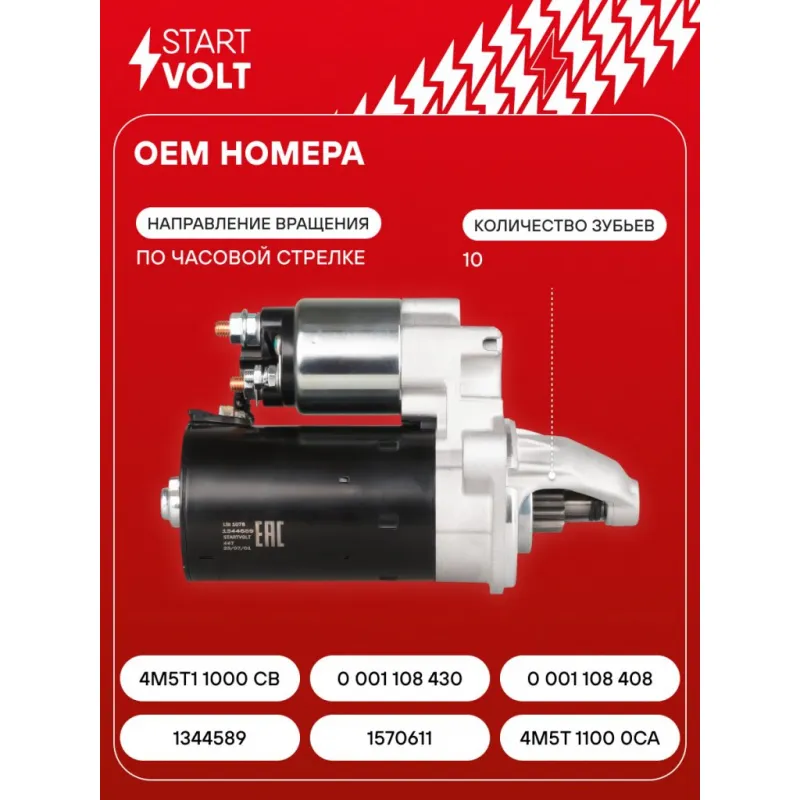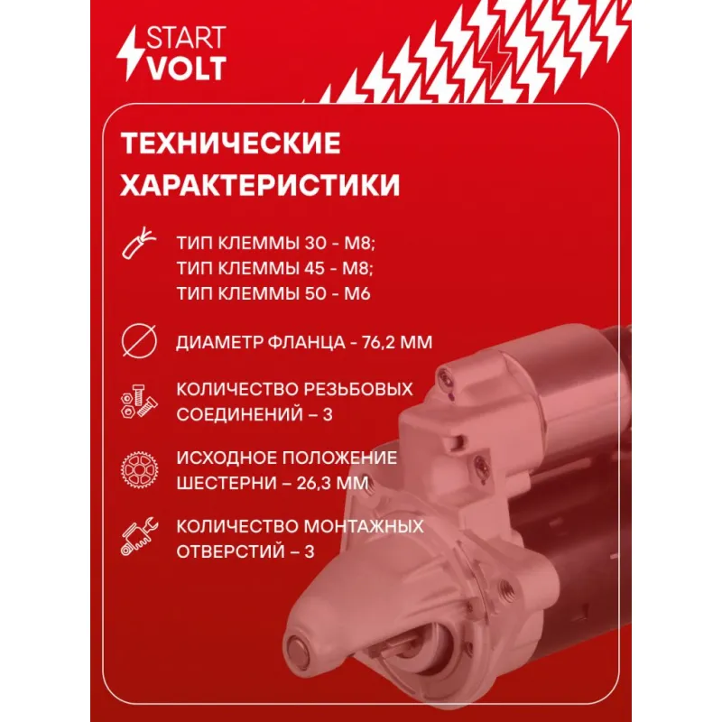 Стартер для автомобилей Ford Focus II (04-)/C-Max (03-) 1.4i/1.6i/1.6Ti (тип Bosch) 1,4кВт Описание: Оригинальный стартер STARTVOLT LSt 1078 мощностью 1,4 кВт предназначен для пуска автомобильного двигателя внутреннего сгорания. Предназначен для автомобилей FORD C-MAX, FOCUS.. Подбор по VIN-номеру вашего автомобиля - через кнопку 'Задать вопрос'. Специалист проверит применяемость и ответит вам. Полностью повторяет параметры оригинальных изделий, обеспечивая надёжный запуск двигателя при любых условиях. Изготовлен с соблюдением оригинальных геометрических параметров, полностью совместим с заводскими узлами. Преимущества: • Полное соответствие оригинальным узлам; • Совместим с оригинальными деталями; • Длительный срок службы и устойчивость к износу; • Стабильная работа системы запуска; • Высокоточная сборка с пооперационным контролем качества; • Каждый стартер проходит стендовое тестирование — протокол в комплекте; • Надёжность при любом запуске двигателя; • STARTVOLT — 15 лет на рынке автоэлектрики — нам доверяют профессионалы; • Сертифицирован по стандарту EAC (ЕАЭС) — соответствует требованиям безопасности и качества. Товар новый, не восстановленный. Готов к установке. Отличный выбор для уверенного запуска двигателя в любых условиях. Характеристики: Артикул: LSt 1078 OEM номера: 1344589, 1570611, 4M5T 1100 0CA, 4M5T1 1000 CB, 0 001 108 430, 0 001 108 408 Номинальное напряжение, В: 12 Количество зубьев: 10 Направление вращения: по часовой стрелке Мощность, кВт: 1,4 Тип клеммы 30: M8 Тип клеммы 45: M8 Тип клеммы 50: M6 Количество резьбовых соединений: 3 Диаметр фланца, мм: 76,2 Исходное положение шестерни, мм: 26,3 Количество монтажных отверстий: 3 Количество на автомобиль: 1 Подходит для авто: Ford Focus II (05-), Focus II (05-), C-Max (03-) Для проверки применяемости отправьте VIN автомобиля через вкладку "Есть вопросы о товаре?" Комплектация: Индивидуальный технический паспорт - 1 шт Стартер - 1 шт Паспорт изделия/гарантийный талон - 1 шт Гарантия: от 1 года.