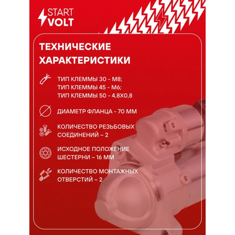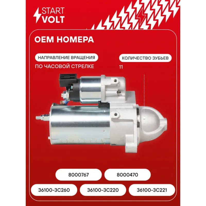 Стартер для автомобилей Hyundai Grand Santa Fe (13-) 2.2CRDi/Grandeur (11-) 3.0i 1,2кВт Описание: Оригинальный стартер STARTVOLT LSt 0835 мощностью 1,2 кВт предназначен для пуска автомобильного двигателя внутреннего сгорания. Предназначен для автомобилей HYUNDAI GRANDEUR, SANTA FE, KIA SORENTO.. Подбор по VIN-номеру вашего автомобиля - через кнопку 'Задать вопрос'. Специалист проверит применяемость и ответит вам. Полностью повторяет параметры оригинальных изделий, обеспечивая надёжный запуск двигателя при любых условиях. Изготовлен с соблюдением оригинальных геометрических параметров, полностью совместим с заводскими узлами. Преимущества: • Полное соответствие оригинальным узлам; • Совместим с оригинальными деталями; • Длительный срок службы и устойчивость к износу; • Стабильная работа системы запуска; • Высокоточная сборка с пооперационным контролем качества; • Каждый стартер проходит стендовое тестирование — протокол в комплекте; • Надёжность при любом запуске двигателя; • STARTVOLT — 15 лет на рынке автоэлектрики — нам доверяют профессионалы; • Сертифицирован по стандарту EAC (ЕАЭС) — соответствует требованиям безопасности и качества. Товар новый, не восстановленный. Готов к установке. Отличный выбор для уверенного запуска двигателя в любых условиях. Характеристики: Артикул: LSt 0835 OEM номера: 36100-3C260, 36100-3C220, 36100-3C221, 8000767, 8000470 Номинальное напряжение, В: 12 Количество зубьев: 11 Направление вращения: по часовой стрелке Мощность, кВт: 1,2 Тип клеммы 30: M8 Тип клеммы 45: M6 Тип клеммы 50: 4,8x0,8 Количество резьбовых соединений: 2 Диаметр фланца, мм: 70 Исходное положение шестерни, мм: 16 Сопутствующий товар: Втягивающие реле: VSR 0808 Сопутствующий товар: Щёточные узлы: VBS 0808 Сопутствующий товар: Приводы стартеров (бендиксы): VCS 0803 Количество монтажных отверстий: 2 Количество на автомобиль: 1 Подходит для авто: Kia Sorento III (14-) Hyundai Grandeur (11-) Для проверки применяемости отправьте VIN автомобиля через вкладку "Есть вопросы о товаре?" Комплектация: Индивидуальный технический паспорт - 1 шт Стартер - 1 шт Паспорт изделия/гарантийный талон - 1 шт Гарантия: от 1 года.