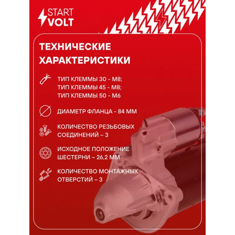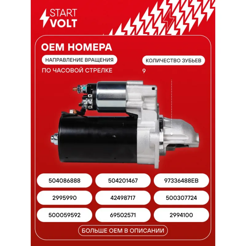 Стартер для автомобилей Iveco Daily (11-) 3.0D/УАЗ Патриот 2.3JTD 2,5кВт Описание: Оригинальный стартер STARTVOLT LSt 1620 мощностью 2,5 кВт предназначен для пуска автомобильного двигателя внутреннего сгорания. Предназначен для автомобилей IVECO DAILY, MASSIF, UAZ PATRIOT.. Подбор по VIN-номеру вашего автомобиля - через кнопку 'Задать вопрос'. Специалист проверит применяемость и ответит вам. Полностью повторяет параметры оригинальных изделий, обеспечивая надёжный запуск двигателя при любых условиях. Изготовлен с соблюдением оригинальных геометрических параметров, полностью совместим с заводскими узлами. Преимущества: • Полное соответствие оригинальным узлам; • Совместим с оригинальными деталями; • Длительный срок службы и устойчивость к износу; • Стабильная работа системы запуска; • Высокоточная сборка с пооперационным контролем качества; • Каждый стартер проходит стендовое тестирование — протокол в комплекте; • Надёжность при любом запуске двигателя; • STARTVOLT — 15 лет на рынке автоэлектрики — нам доверяют профессионалы; • Сертифицирован по стандарту EAC (ЕАЭС) — соответствует требованиям безопасности и качества. Товар новый, не восстановленный. Готов к установке. Отличный выбор для уверенного запуска двигателя в любых условиях. Характеристики: Артикул: LSt 1620 OEM номера: 500059592, 69502571, 2994100, 2995990, 42498717, 500307724, 504086888, 504201467, 97336488EB, 0 001 109 462, 0 001 109 306, 1516689R, MK666919 Номинальное напряжение, В: 12 Количество зубьев: 9 Направление вращения: по часовой стрелке Мощность, кВт: 2,5 Тип клеммы 30: M8 Тип клеммы 45: M8 Тип клеммы 50: M6 Количество резьбовых соединений: 3 Диаметр фланца, мм: 84 Исходное положение шестерни, мм: 26,2 Сопутствующий товар: Втягивающие реле: VSR 1620 Сопутствующий товар: Щёточные узлы: VBS 1020 Сопутствующий товар: Приводы стартеров (бендиксы): VCS 1621 Сопутствующий товар: Роторы: SR 1020 Количество монтажных отверстий: 3 Количество на автомобиль: 1 Комплектация: Индивидуальный технический паспорт - 1 шт Стартер - 1 шт Паспорт изделия/гарантийный талон - 1 шт Гарантия: от 1 года.