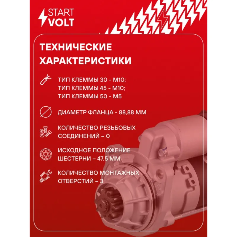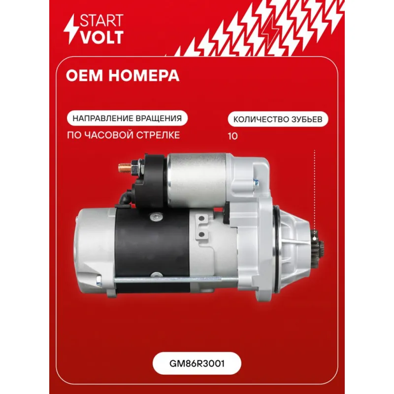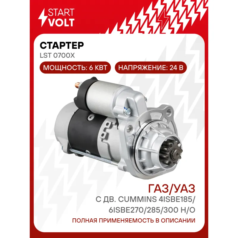 Стартер для автомобилей КАМАЗ с дв. Cummins 4ISBe185/6ISBe270/285/300 н/о 24В 6кВт Характеристики: Артикул: LSt 0700X OEM номера: GM86R3001 Номинальное напряжение, В: 24 Количество зубьев: 10 Направление вращения: по часовой стрелке Мощность, кВт: 6 Тип клеммы 30: M10 Тип клеммы 45: M10 Тип клеммы 50: M5 Количество резьбовых соединений: 0 Диаметр фланца, мм: 88,9 Исходное положение шестерни, мм: 47,5 Количество монтажных отверстий: 3 Количество на автомобиль: 1 Комплектация: Индивидуальный технический паспорт - 1 шт Стартер - 1 шт Паспорт изделия/гарантийный талон - 1 шт Гарантия: от 1 года.
