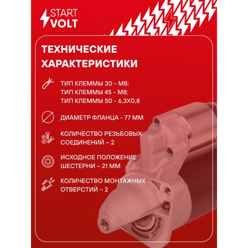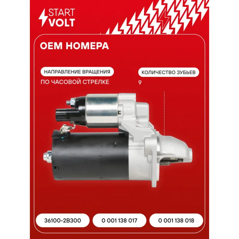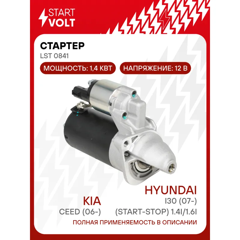 Стартер для автомобилей Kia Ceed (06-)/Hyundai i30 (07-) (Start-Stop) 1.4i/1.6i 1,4кВт Характеристики: Артикул: LSt 0841 OEM номера: 36100-2B300, 0 001 138 017, 0 001 138 018 Номинальное напряжение, В: 12 Количество зубьев: 9 Направление вращения: по часовой стрелке Мощность, кВт: 1,4 Тип клеммы 30: M8 Тип клеммы 45: M8 Тип клеммы 50: 6,3x0,8 Количество резьбовых соединений: 2 Диаметр фланца, мм: 77 Исходное положение шестерни, мм: 21 Количество монтажных отверстий: 2 Количество на автомобиль: 1 Комплектация: Индивидуальный технический паспорт - 1 шт Стартер - 1 шт Паспорт изделия/гарантийный талон - 1 шт Гарантия: от 1 года.