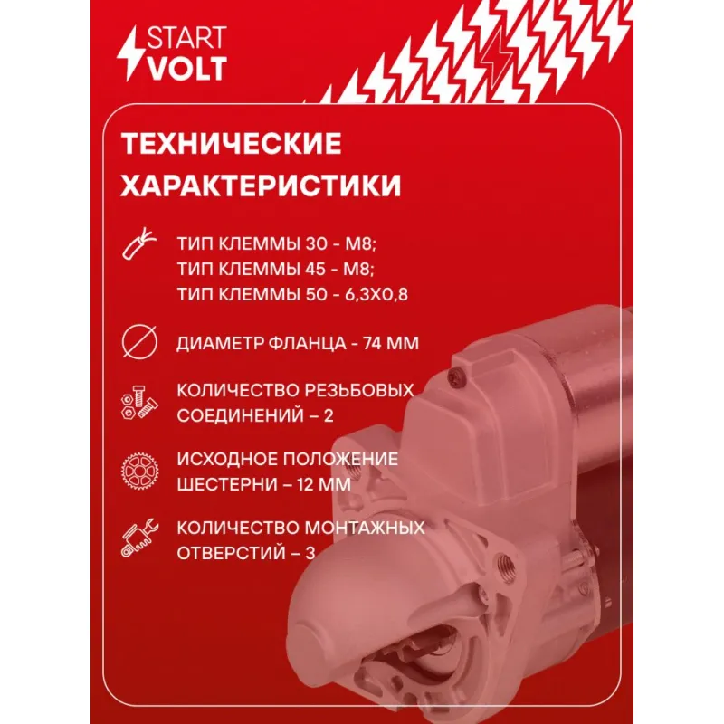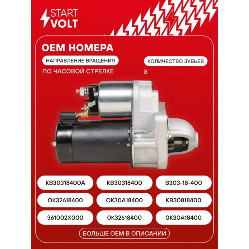 Стартер для автомобилей Kia Rio (02-)/Shuma II (01-)/Spectra (00-) 1.5i/1.6i 0,9кВт Описание: Оригинальный стартер STARTVOLT LSt 0812 мощностью 0,85 кВт предназначен для пуска автомобильного двигателя внутреннего сгорания. Предназначен для автомобилей KIA PRIDE, RIO, CERATO, SHUMA, CARENS.. Подбор по VIN-номеру вашего автомобиля - через кнопку 'Задать вопрос'. Специалист проверит применяемость и ответит вам. Полностью повторяет параметры оригинальных изделий, обеспечивая надёжный запуск двигателя при любых условиях. Изготовлен с соблюдением оригинальных геометрических параметров, полностью совместим с заводскими узлами. Преимущества: • Полное соответствие оригинальным узлам; • Совместим с оригинальными деталями; • Длительный срок службы и устойчивость к износу; • Стабильная работа системы запуска; • Высокоточная сборка с пооперационным контролем качества; • Каждый стартер проходит стендовое тестирование — протокол в комплекте; • Надёжность при любом запуске двигателя; • STARTVOLT — 15 лет на рынке автоэлектрики — нам доверяют профессионалы; • Сертифицирован по стандарту EAC (ЕАЭС) — соответствует требованиям безопасности и качества. Товар новый, не восстановленный. Готов к установке. Отличный выбор для уверенного запуска двигателя в любых условиях. Характеристики: Артикул: LSt 0812 OEM номера: 361002X000, 0K32618400, 0K30A18400, OK32618400, OK30A18400, KB30818400, KB30318400A, KB30318400, B303-18-400, B303-18-400A, M003T33281, 0 986 025 710, 112847, KK32618400 Номинальное напряжение, В: 12 Количество зубьев: 8 Направление вращения: по часовой стрелке Мощность, кВт: 0,85 Тип клеммы 30: M8 Тип клеммы 45: M8 Тип клеммы 50: 6,3x0,8 Количество резьбовых соединений: 2 Диаметр фланца, мм: 74 Исходное положение шестерни, мм: 12 Количество монтажных отверстий: 3 Количество на автомобиль: 1 Подходит для авто: Kia Shuma II (01-), Pride (87-), Rio I (00-), Spectra (00-) Для проверки применяемости отправьте VIN автомобиля через вкладку "Есть вопросы о товаре?" Комплектация: Индивидуальный технический паспорт - 1 шт Стартер - 1 шт Паспорт изделия/гарантийный талон - 1 шт Гарантия: от 1 года.