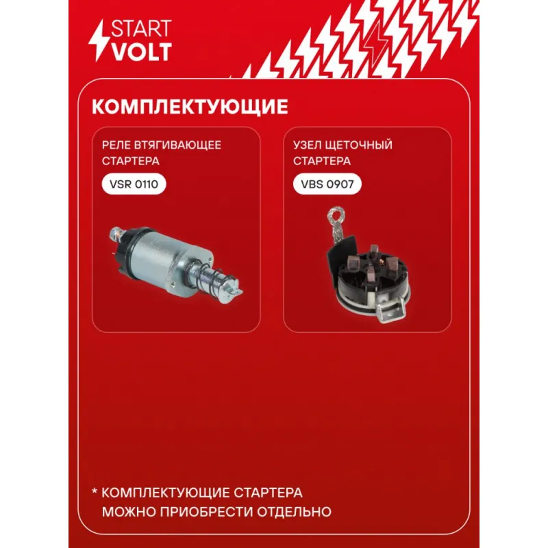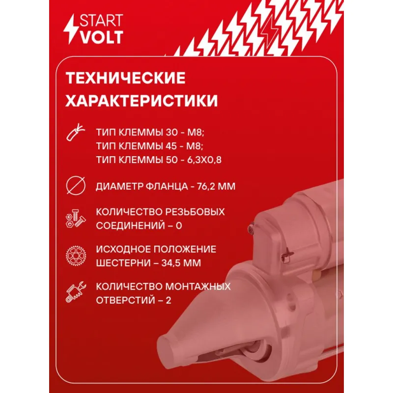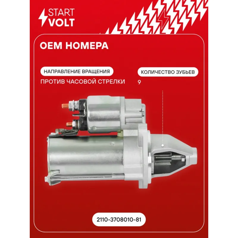 Стартер для автомобилей Лада 2110 и модификации н/о (тип АвтоВАЗ) 1,4кВт Описание: Оригинальный стартер STARTVOLT LSt 0112 мощностью 1,4 кВт предназначен для пуска автомобильного двигателя внутреннего сгорания. Предназначен для автомобилей LADA ВАЗ 2110-2112.. Подбор по VIN-номеру вашего автомобиля - через кнопку 'Задать вопрос'. Специалист проверит применяемость и ответит вам. Полностью повторяет параметры оригинальных изделий, обеспечивая надёжный запуск двигателя при любых условиях. Изготовлен с соблюдением оригинальных геометрических параметров, полностью совместим с заводскими узлами. Преимущества: • Полное соответствие оригинальным узлам; • Совместим с оригинальными деталями; • Длительный срок службы и устойчивость к износу; • Стабильная работа системы запуска; • Высокоточная сборка с пооперационным контролем качества; • Каждый стартер проходит стендовое тестирование — протокол в комплекте; • Надёжность при любом запуске двигателя; • STARTVOLT — 15 лет на рынке автоэлектрики — нам доверяют профессионалы; • Сертифицирован по стандарту EAC (ЕАЭС) — соответствует требованиям безопасности и качества. Товар новый, не восстановленный. Готов к установке. Отличный выбор для уверенного запуска двигателя в любых условиях. Характеристики: Артикул: LSt 0112 OEM номера: 2110-3708010-81 Количество зубьев: 9 Направление вращения: против часовой стрелки Мощность, кВт: 1,4 Тип клеммы 30: M8 Тип клеммы 45: M8 Тип клеммы 50: 6,3x0,8 Количество резьбовых соединений: 0 Диаметр фланца, мм: 76,2 Исходное положение шестерни, мм: 34,5 Количество монтажных отверстий: 2 Количество на автомобиль: 1 Номинальное напряжение, В: 12 Комплектация: Индивидуальный технический паспорт - 1 шт Стартер - 1 шт Паспорт изделия/гарантийный талон - 1 шт Гарантия: от 1 года.
