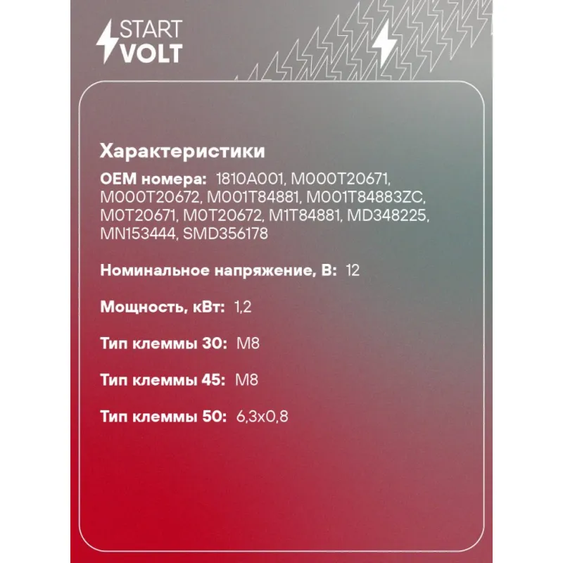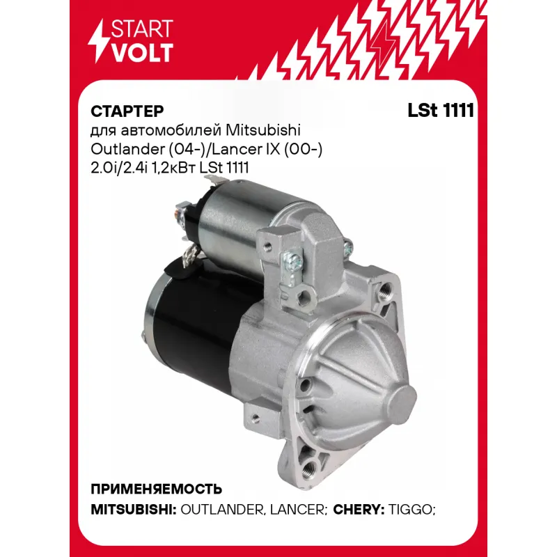 Стартер для автомобилей Mitsubishi Outlander (04-)/Lancer IX (00-) 2.0i/2.4i 1,2кВт Описание: Оригинальный стартер STARTVOLT LSt 1111 мощностью 1,2 кВт предназначен для пуска автомобильного двигателя внутреннего сгорания. Предназначен для автомобилей CHERY TIGGO, MITSUBISHI OUTLANDER, LANCER, GRANDIS.. Подбор по VIN-номеру вашего автомобиля - через кнопку 'Задать вопрос'. Специалист проверит применяемость и ответит вам. Полностью повторяет параметры оригинальных изделий, обеспечивая надёжный запуск двигателя при любых условиях. Изготовлен с соблюдением оригинальных геометрических параметров, полностью совместим с заводскими узлами. Преимущества: • Полное соответствие оригинальным узлам; • Совместим с оригинальными деталями; • Длительный срок службы и устойчивость к износу; • Стабильная работа системы запуска; • Высокоточная сборка с пооперационным контролем качества; • Каждый стартер проходит стендовое тестирование — протокол в комплекте; • Надёжность при любом запуске двигателя; • STARTVOLT — 15 лет на рынке автоэлектрики — нам доверяют профессионалы; • Сертифицирован по стандарту EAC (ЕАЭС) — соответствует требованиям безопасности и качества. Товар новый, не восстановленный. Готов к установке. Отличный выбор для уверенного запуска двигателя в любых условиях. Характеристики: Артикул: LSt 1111 OEM номера: 1810A001, M000T20671, M000T20672, M001T84881, M001T84883ZC, M0T20671, M0T20672, M1T84881, MD348225, MN153444, SMD356178 Номинальное напряжение, В: 12 Количество зубьев: 8 Направление вращения: по часовой стрелке Мощность, кВт: 1,2 Тип клеммы 30: M8 Тип клеммы 45: M8 Тип клеммы 50: 6,3x0,8 Количество резьбовых соединений: 2 Диаметр фланца, мм: 77 Исходное положение шестерни, мм: 10 Сопутствующий товар: Втягивающие реле: VSR 1111 Сопутствующий товар: Щёточные узлы: VBS 2503 Сопутствующий товар: Приводы стартеров (бендиксы): VCS 1109 Количество монтажных отверстий: 2 Количество на автомобиль: 1 Комплектация: Индивидуальный технический паспорт - 1 шт Стартер - 1 шт Паспорт изделия/гарантийный талон - 1 шт Гарантия: от 1 года.