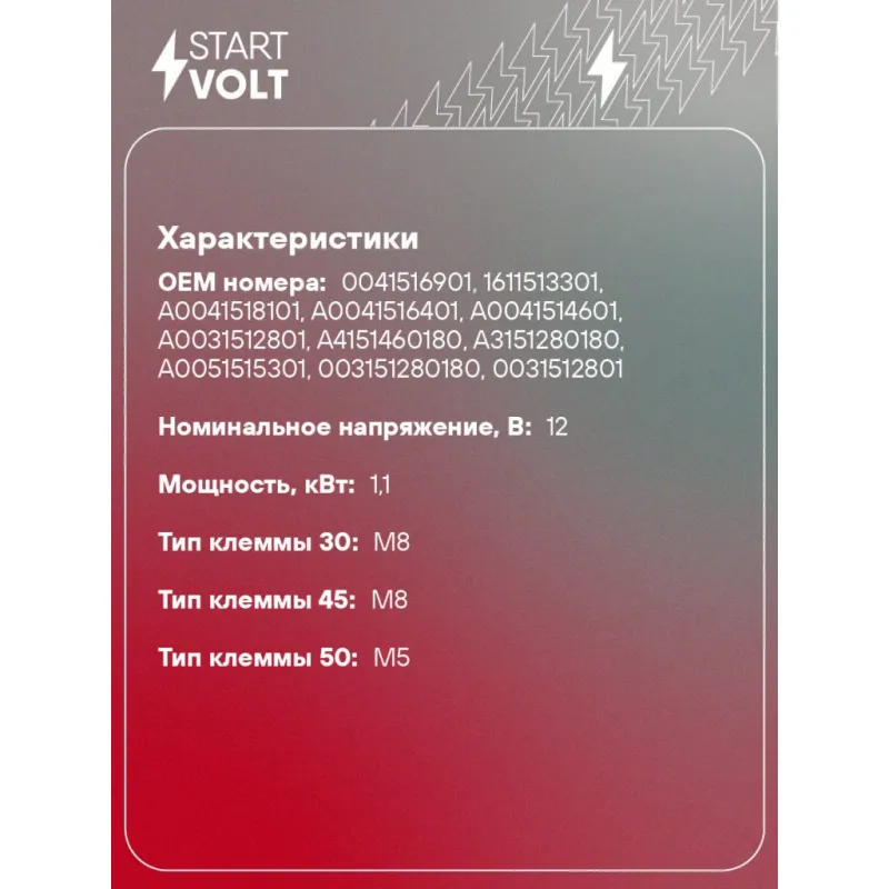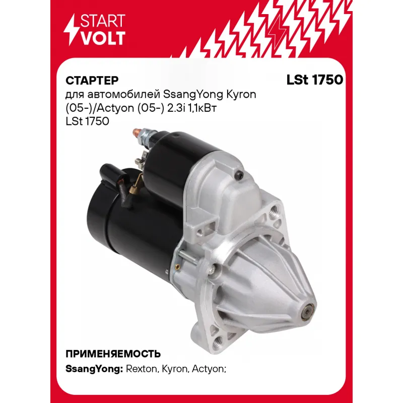 Стартер для автомобилей SsangYong Kyron (05-)/Actyon (05-) 2.3i 1,1кВт Описание: Новый оригинальный стартер STARTVOLT LSt 1750 мощностью 1,1 кВт предназначен для пуска автомобильного двигателя внутреннего сгорания. Подходит для DAEWOO MUSSO, KORANDO, MERCEDES-BENZ VITO, V-Class, T1, SPRINTER, SLK, E-Class, 123, M-Class, CLK, CLC, C-Class, 190, SSANGYONG KORANDO, MUSSO, REXTON, KYRON, ACTYON, TAGAZ TAGER, VW LT.. Изготовлен с соблюдением оригинальных геометрических параметров, полностью совместим с заводскими узлами. Подбор по VIN-номеру вашего автомобиля - через кнопку 'Задать вопрос'. Специалист проверит применяемость и ответит вам. Преимущества: • Полное соответствие оригинальным узлам; • Совместим с оригинальными деталями; • Длительный срок службы и устойчивость к износу; • Стабильная работа системы запуска; • Высокоточная сборка с пооперационным контролем качества; • Каждый стартер проходит стендовое тестирование — протокол в комплекте; • STARTVOLT — 15 лет на рынке автоэлектрики — нам доверяют профессионалы; • Гарантия 2 года; • Сертифицирован по стандарту EAC (ЕАЭС) — соответствует требованиям безопасности и качества. Товар новый, не восстановленный. Готов к установке. Отличный выбор для уверенного запуска двигателя в любых условиях. Характеристики: Артикул: LSt 1750 OEM номера: 0041516901, 1611513301, A0041518101, A0041516401, A0041514601, A0031512801, A4151460180, A3151280180, A0051515301, 003151280180, 0031512801, A5151060180, A4151810180, A4151690180, A4151640180, 005151060180, 004151810180, 004151690180, 004151640180, 0041516401, 004151460180, 41516401, 4151460180, 41514601, 3151280180, 31512801, 0051515301, 51515301, 5151060180, 51510601, 4151810180, 4151690180, 4151640180, 0041518101, 0051513401, 0051517301, 41516901, 41518101, 51513401, 51517301, 0041514601, 1611513401, 69911023GX, 69911023G, 069911023GX, 432675, 436003, 455947 Номинальное напряжение, В: 12 Количество зубьев: 9 Направление вращения: по часовой стрелке Мощность, кВт: 1,1 Тип клеммы 30: M8 Тип клеммы 45: M8 Тип клеммы 50: M5 Количество резьбовых соединений: 2 Диаметр фланца, мм: 82,5 Исходное положение шестерни, мм: 25 Количество монтажных отверстий: 2 Количество на автомобиль: 1 Подходит для авто: SsangYong Rexton (06-), Kyron (05-), Actyon (05-) Для проверки применяемости отправьте VIN автомобиля через вкладку "Есть вопросы о товаре?" Комплектация: Индивидуальный технический паспорт - 1 шт Стартер - 1 шт Паспорт изделия/гарантийный талон - 1 шт Гарантия: от 1 года.