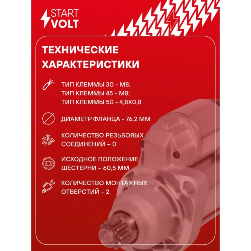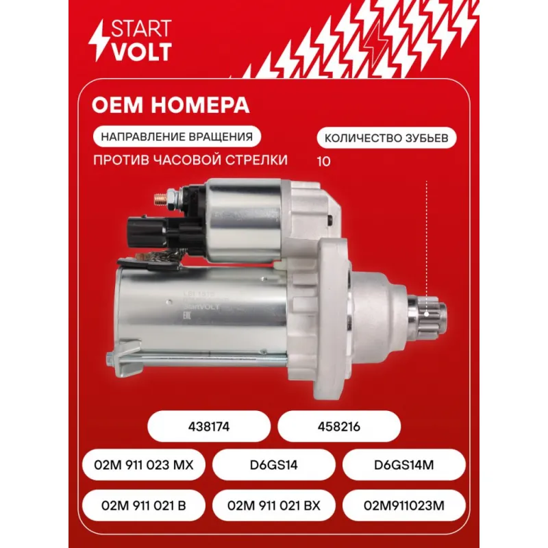 Стартер для автомобилей VAG Polo Sedan (10-)/Octavia A5 (04-)/Jetta III (05-) 1.6i AT (тип Valeo) 1,1кВт Описание: Новый оригинальный стартер STARTVOLT LSt 1815 мощностью 1,1 кВт предназначен для пуска автомобильного двигателя внутреннего сгорания. Подходит для AUDI TT, Q3, A3, A1, SEAT ALTEA, IBIZA, LEON, TOLEDO, SKODA FABIA, OCTAVIA, ROOMSTER, SUPERB, YETI, VW GOLF, GOLF PLUS, EOS, CC, BORA, BEETLE, TIGUAN, PASSAT, JETTA, NEW BEETLE, POLO, SCIROCCO, TOURAN.. Изготовлен с соблюдением оригинальных геометрических параметров, полностью совместим с заводскими узлами. Подбор по VIN-номеру вашего автомобиля - через кнопку 'Задать вопрос'. Специалист проверит применяемость и ответит вам. Преимущества: • Полное соответствие оригинальным узлам; • Совместим с оригинальными деталями; • Длительный срок службы и устойчивость к износу; • Стабильная работа системы запуска; • Высокоточная сборка с пооперационным контролем качества; • Каждый стартер проходит стендовое тестирование — протокол в комплекте; • STARTVOLT — 15 лет на рынке автоэлектрики — нам доверяют профессионалы; • Гарантия 2 года; • Сертифицирован по стандарту EAC (ЕАЭС) — соответствует требованиям безопасности и качества. Товар новый, не восстановленный. Готов к установке. Отличный выбор для уверенного запуска двигателя в любых условиях. Характеристики: Артикул: LSt 1815 OEM номера: 02M 911 021 B, 02M 911 021 BX, 02M911023M, 02M 911 023 MX, D6GS14, D6GS14M, 438174, 458216 Номинальное напряжение, В: 12 Количество зубьев: 10 Направление вращения: против часовой стрелки Мощность, кВт: 1,1 Тип клеммы 30: M8 Тип клеммы 45: M8 Тип клеммы 50: 4,8x0,8 Количество резьбовых соединений: 0 Диаметр фланца, мм: 76,2 Исходное положение шестерни, мм: 60,5 Сопутствующий товар: Роторы: SR 1815 Количество монтажных отверстий: 2 Количество на автомобиль: 1 Подходит для авто: Volkswagen Tiguan (08-), Passat B6 (05-), Passat B6 (05-), Passat B6 (05-) Для проверки применяемости отправьте VIN автомобиля через вкладку "Есть вопросы о товаре?" Комплектация: Индивидуальный технический паспорт - 1 шт Стартер - 1 шт Паспорт изделия/гарантийный талон - 1 шт Гарантия: от 1 года.