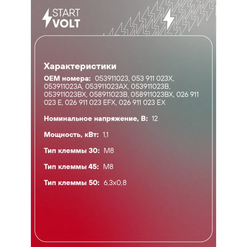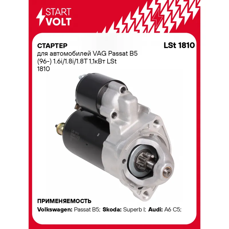 Стартер для автомобилей VAG Passat B5 (96-) 1.6i/1.8i/1.8T 1,1кВт Описание: Новый оригинальный стартер STARTVOLT LSt 1810 мощностью 1,1 кВт предназначен для пуска автомобильного двигателя внутреннего сгорания. Подходит для AUDI COUPE, CABRIOLET, A6, A4, 90, 80, 100, SKODA ROOMSTER, VW PASSAT.. Изготовлен с соблюдением оригинальных геометрических параметров, полностью совместим с заводскими узлами. Подбор по VIN-номеру вашего автомобиля - через кнопку 'Задать вопрос'. Специалист проверит применяемость и ответит вам. Преимущества: • Полное соответствие оригинальным узлам; • Совместим с оригинальными деталями; • Длительный срок службы и устойчивость к износу; • Стабильная работа системы запуска; • Высокоточная сборка с пооперационным контролем качества; • Каждый стартер проходит стендовое тестирование — протокол в комплекте; • STARTVOLT — 15 лет на рынке автоэлектрики — нам доверяют профессионалы; • Гарантия 2 года; • Сертифицирован по стандарту EAC (ЕАЭС) — соответствует требованиям безопасности и качества. Товар новый, не восстановленный. Готов к установке. Отличный выбор для уверенного запуска двигателя в любых условиях. Характеристики: Артикул: LSt 1810 OEM номера: 053911023, 053 911 023X, 053911023A, 053911023AX, 053911023B, 053911023BX, 058911023B, 058911023BX, 026 911 023 E, 026 911 023 EFX, 026 911 023 EX, 026 911 023 F, 026 911 023 FX, 0 001 107 017, 0 001 107 018, 0 001 107 054, 0 001 107 055, 0 001 107 069, 0 001 114 003, 0 001 114 004, 0 001 114 015, 0 001 114 016, 0 986 014 640, 0 986 016 330, 0 986 019 477, F042002028 Номинальное напряжение, В: 12 Количество зубьев: 9 Направление вращения: по часовой стрелке Мощность, кВт: 1,1 Тип клеммы 30: M8 Тип клеммы 45: M8 Тип клеммы 50: 6,3x0,8 Количество резьбовых соединений: 2 Диаметр фланца, мм: 82,5 Исходное положение шестерни, мм: 14 Сопутствующий товар: Втягивающие реле: VSR 1810 Сопутствующий товар: Щёточные узлы: VBS 1810 Сопутствующий товар: Приводы стартеров (бендиксы): VCS 1815 Сопутствующий товар: Роторы: SR 1810 Количество монтажных отверстий: 2 Количество на автомобиль: 1 Подходит для авто: Volkswagen Passat B5 (96-) Skoda Superb I (01-) Audi A6 C5 (97-) Для проверки применяемости отправьте VIN автомобиля через вкладку "Есть вопросы о товаре?" Комплектация: Индивидуальный технический паспорт - 1 шт Стартер - 1 шт Паспорт изделия/гарантийный талон - 1 шт Гарантия: от 1 года.