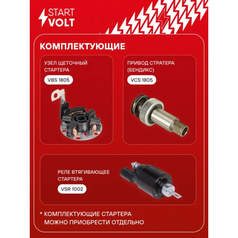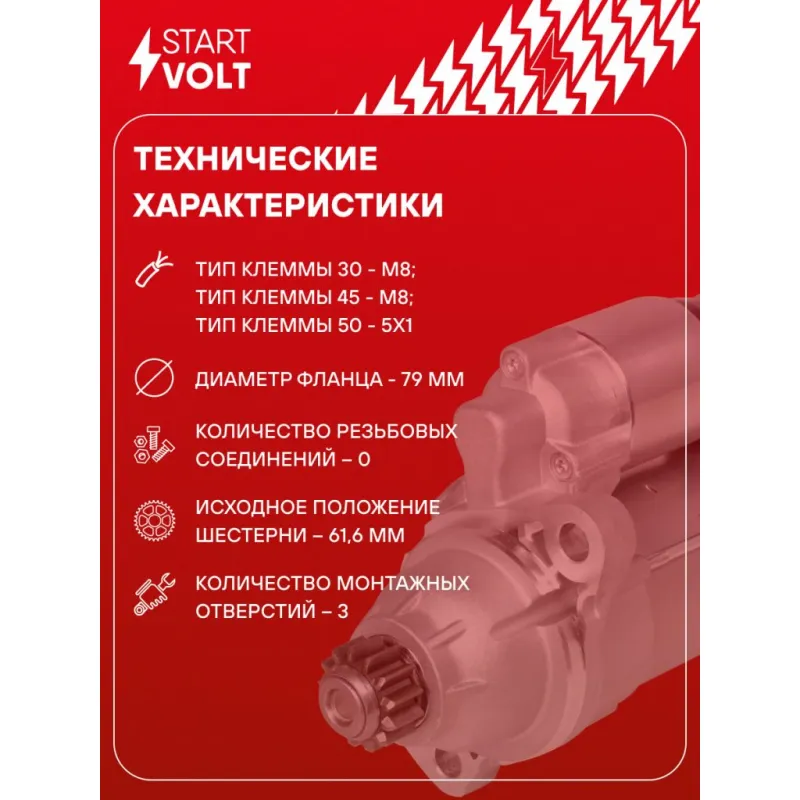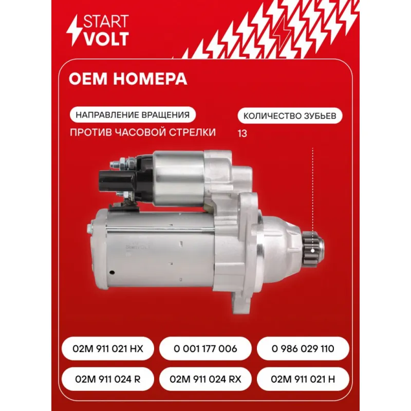 Стартер для автомобилей VAG Polo (20-)/Octavia A7 (13-) 1.6i 1,4кВт Описание: Оригинальный стартер STARTVOLT LSt 1805 мощностью 1,4 кВт предназначен для пуска автомобильного двигателя внутреннего сгорания. Предназначен для автомобилей AUDI Q3, A3, A1, SEAT TOLEDO, Mii, LEON, IBIZA, SKODA RAPID, FABIA, CITIGO, VW UP, T6, TIGUAN, POLO, PASSAT, JETTA, GOLF, BEETLE.. Подбор по VIN-номеру вашего автомобиля - через кнопку 'Задать вопрос'. Специалист проверит применяемость и ответит вам. Полностью повторяет параметры оригинальных изделий, обеспечивая надёжный запуск двигателя при любых условиях. Изготовлен с соблюдением оригинальных геометрических параметров, полностью совместим с заводскими узлами. Преимущества: • Полное соответствие оригинальным узлам; • Совместим с оригинальными деталями; • Длительный срок службы и устойчивость к износу; • Стабильная работа системы запуска; • Высокоточная сборка с пооперационным контролем качества; • Каждый стартер проходит стендовое тестирование — протокол в комплекте; • Надёжность при любом запуске двигателя; • STARTVOLT — 15 лет на рынке автоэлектрики — нам доверяют профессионалы; • Сертифицирован по стандарту EAC (ЕАЭС) — соответствует требованиям безопасности и качества. Товар новый, не восстановленный. Готов к установке. Отличный выбор для уверенного запуска двигателя в любых условиях. Характеристики: Артикул: LSt 1805 OEM номера: 02M 911 024 R, 02M 911 024 RX, 02M 911 021 H, 02M 911 021 HX, 0 001 177 006, 0 986 029 110 Номинальное напряжение, В: 12 Количество зубьев: 13 Направление вращения: против часовой стрелки Мощность, кВт: 1,4 Тип клеммы 30: M8 Тип клеммы 45: M8 Тип клеммы 50: 4,8x0,8 Количество резьбовых соединений: 0 Диаметр фланца, мм: 79 Исходное положение шестерни, мм: 61,6 Сопутствующий товар: Втягивающие реле: VSR 1002 Сопутствующий товар: Щёточные узлы: VBS 1805 Сопутствующий товар: Роторы: SR 1805 Количество монтажных отверстий: 3 Количество на автомобиль: 1 Комплектация: Индивидуальный технический паспорт - 1 шт Стартер - 1 шт Паспорт изделия/гарантийный талон - 1 шт Гарантия: от 1 года.