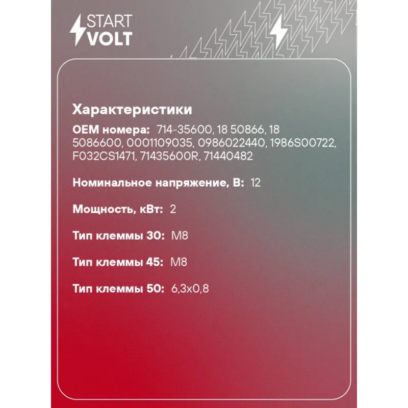 Стартер для спецтехники JCB/Perkins с дв. Perkins 400 series 12В 2кВт Характеристики: Артикул: LSt 3006 OEM номера: 714-35600, 18 50866, 18 5086600, 0001109035, 0986022440, 1986S00722, F032CS1471, 71435600R, 71440482 Номинальное напряжение, В: 12 Количество зубьев: 9 Направление вращения: по часовой стрелке Мощность, кВт: 2 Тип клеммы 30: M8 Тип клеммы 45: M8 Тип клеммы 50: 6,3x0,8 Количество резьбовых соединений: 0 Диаметр фланца, мм: 74 Исходное положение шестерни, мм: 20,5 Количество монтажных отверстий: 2 Количество на автомобиль: 1 Комплектация: Индивидуальный технический паспорт - 1 шт Стартер - 1 шт Паспорт изделия/гарантийный талон - 1 шт Гарантия: от 1 года.