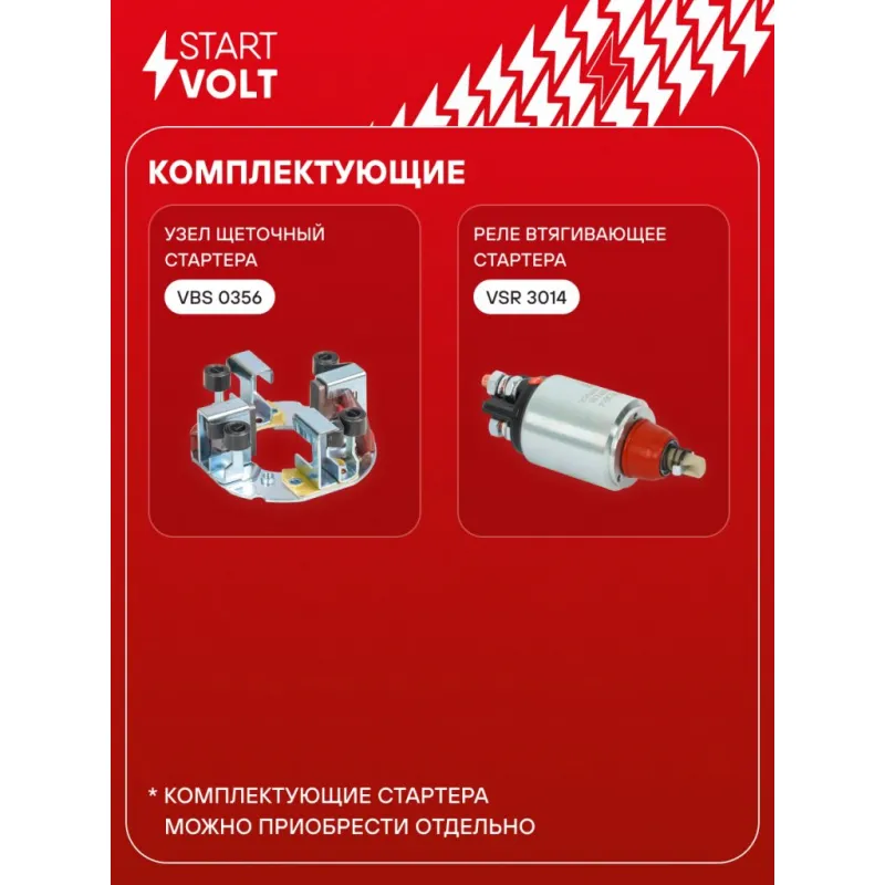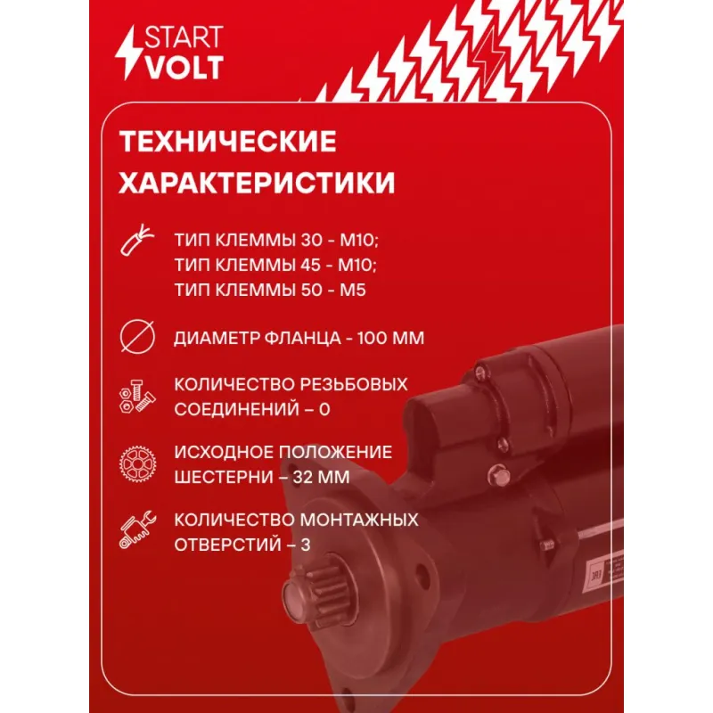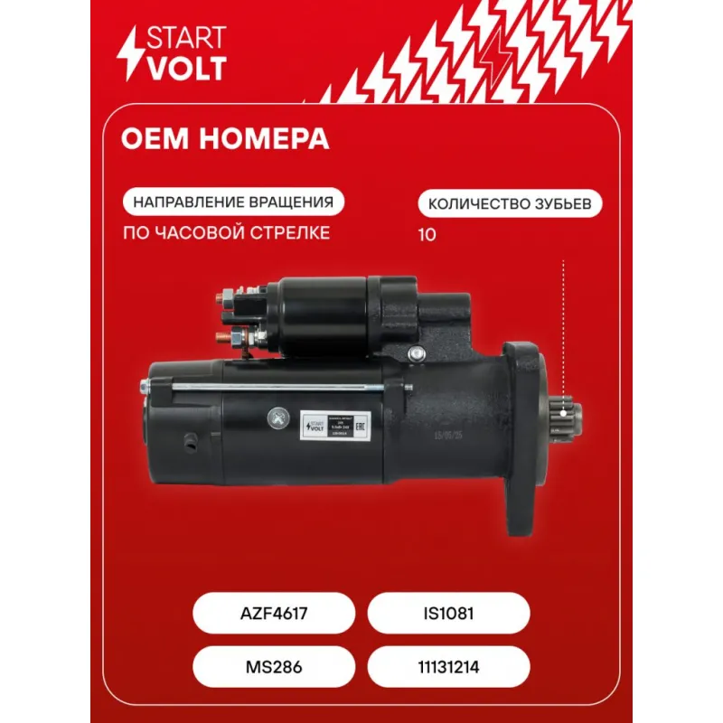 Стартер для спецтехники МТЗ-1221/ЗИЛ/ГАЗ/МАЗ/ПАЗ с дв. ММЗ-Д243/245/260 ЕВРО-2 24В 5,5кВт Описание: Оригинальный стартер STARTVOLT LSt 0614 мощностью 5,5 кВт предназначен для пуска автомобильного двигателя внутреннего сгорания. Предназначен для автомобилей BELARUS Series 100, 1021.. Подбор по VIN-номеру вашего автомобиля - через кнопку 'Задать вопрос'. Специалист проверит применяемость и ответит вам. Полностью повторяет параметры оригинальных изделий, обеспечивая надёжный запуск двигателя при любых условиях. Изготовлен с соблюдением оригинальных геометрических параметров, полностью совместим с заводскими узлами. Преимущества: • Полное соответствие оригинальным узлам; • Совместим с оригинальными деталями; • Длительный срок службы и устойчивость к износу; • Стабильная работа системы запуска; • Высокоточная сборка с пооперационным контролем качества; • Каждый стартер проходит стендовое тестирование — протокол в комплекте; • Надёжность при любом запуске двигателя; • STARTVOLT — 15 лет на рынке автоэлектрики — нам доверяют профессионалы; • Сертифицирован по стандарту EAC (ЕАЭС) — соответствует требованиям безопасности и качества. Товар новый, не восстановленный. Готов к установке. Отличный выбор для уверенного запуска двигателя в любых условиях. Характеристики: Артикул: LSt 0614 OEM номера: MS286, 11131214, AZF4617, IS1081 Номинальное напряжение, В: 24 Количество зубьев: 10 Направление вращения: по часовой стрелке Мощность, кВт: 5,5 Тип клеммы 30: M10 Тип клеммы 45: M10 Тип клеммы 50: M5 Количество резьбовых соединений: 0 Диаметр фланца, мм: 100 Исходное положение шестерни, мм: 32 Количество монтажных отверстий: 3 Количество на автомобиль: 1 Комплектация: Индивидуальный технический паспорт - 1 шт Стартер - 1 шт Паспорт изделия/гарантийный талон - 1 шт Гарантия: от 1 года.