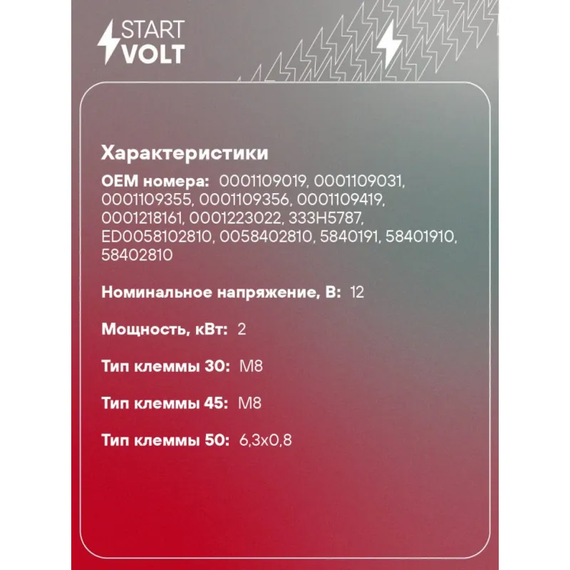 Стартер для спецтехники МТЗ 310/311/320/321 с дв. Lombardini LDW1503/1603/2004/2204 12В 2кВт Описание: Оригинальный стартер STARTVOLT LSt 3013 мощностью 2 кВт предназначен для пуска автомобильного двигателя внутреннего сгорания. Предназначен для автомобилей . Подбор по VIN-номеру вашего автомобиля - через кнопку 'Задать вопрос'. Специалист проверит применяемость и ответит вам. Полностью повторяет параметры оригинальных изделий, обеспечивая надёжный запуск двигателя при любых условиях. Изготовлен с соблюдением оригинальных геометрических параметров, полностью совместим с заводскими узлами. Преимущества: • Полное соответствие оригинальным узлам; • Совместим с оригинальными деталями; • Длительный срок службы и устойчивость к износу; • Стабильная работа системы запуска; • Высокоточная сборка с пооперационным контролем качества; • Каждый стартер проходит стендовое тестирование — протокол в комплекте; • Надёжность при любом запуске двигателя; • STARTVOLT — 15 лет на рынке автоэлектрики — нам доверяют профессионалы; • Сертифицирован по стандарту EAC (ЕАЭС) — соответствует требованиям безопасности и качества. Товар новый, не восстановленный. Готов к установке. Отличный выбор для уверенного запуска двигателя в любых условиях. Характеристики: Артикул: LSt 3013 OEM номера: 0001109019, 0001109031, 0001109355, 0001109356, 0001109419, 0001218161, 0001223022, 333H5787, ED0058102810, 0058402810, 5840191, 58401910, 58402810 Номинальное напряжение, В: 12 Количество зубьев: 9 Направление вращения: по часовой стрелке Мощность, кВт: 2 Тип клеммы 30: M8 Тип клеммы 45: M8 Тип клеммы 50: 6,3x0,8 Количество резьбовых соединений: 0 Диаметр фланца, мм: 82,5 Исходное положение шестерни, мм: 15,5 Количество монтажных отверстий: 2 Количество на автомобиль: 1 Комплектация: Индивидуальный технический паспорт - 1 шт Стартер - 1 шт Паспорт изделия/гарантийный талон - 1 шт Гарантия: от 1 года.