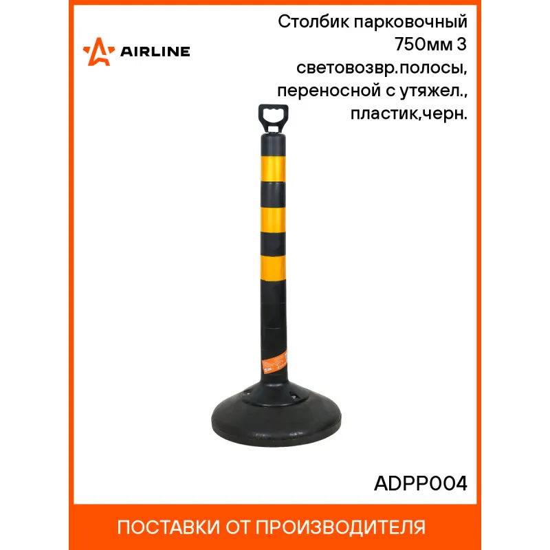 Столбик парковочный 750мм(СПУ) 3 световозвр.полосы, переносной с утяжел., пластик,черн. Описание: Столбик используется, как ограждение при проведении дорожно-строительных работ или для обозначения парковочных мест, перераспределения транспортных потоков, для обозначения аварийных участков и мест ДТП и т.п. Столбик изготовлен из экологически безопасного специализированного полимерного композита черного цвета и оснащен светоотражающими полосами, делающими его заметным в темное время. Материал основания: полимер-песчаная смесь.Оснащен верхней металлической ручкой для возможной переноски и за которую зацепляется оградительная цепочка или лента. Применение: Дорожно-ремонтные работы; Парковки; Отделения пешеходных зон; Аэропорты; Торговые центры; Характеристики: Артикул: ADPP004 Цвет: черный Высота, мм: 920 Вид: Упругий с утяжелителем Форма основания: круг Размер основания, мм: 380*380 Мин. температура эксплуатации, °С: -30 Кол-во полос, шт: 3 Высота полосы, мм: 50 Диаметр столбика, мм: 70 Макс. температура эксплуатации, °С: 50 Комплектация: Столбик с наклейкой - 1 шт Гарантия: от 1 года.